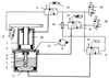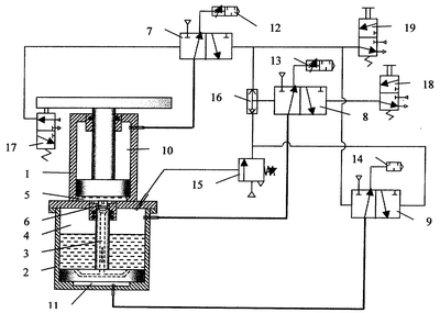 После необходимой выдержки под высоким давлением нажимают на пневмокнопку 19, которая выдает сигнал управления на трехходовые двухпозиционные пневмораспределители 9 и 7, переводя их в другое стабильное положение. (Вместо пневмокнопки 19 может быть использовано реле времени или другое устройство, выдающее сигнал управления.) Сигнал управления также поступает через клапан «или» 16 на трехходовый двухпозиционный пневмораспределитель 8, но он остается в своем исходном положении, как показано на схеме. При этом сжатый воздух из поршневой полости 11 силового цилиндра быстро сбрасывается в атмосферу через трехходовый двухпозиционный пневмораспределитель 9 и глушитель 14. В это же время сжатый воздух подается в штоковую полость 10 силового цилиндра, поршень силового цилиндра 2 опускается. В нижнем положении, при упоре своими выступами в дно, открывается клапан 6, выпуская масло из поршневой полости 5 рабочего цилиндра в штоковую полость 4 силового цилиндра и давая тем самым поршню рабочего цилиндра 1 опуститься вниз. В крайнем нижнем положении плита с поршнем рабочего цилиндра 1 нажимает на толкатель концевого пневмораспределителя 17, при этом сжатый воздух переводит трехходовый двухпозиционный пневмораспределитель 7 в исходное положение и сжатый воздух из штоковой полости 10 рабочего цилиндра выходит в атмосферу.