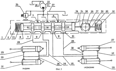 После завершения подъема, к примеру, на ровном участке рама автомобиля выравнивается, а кузов сзади остается еще в поднятом положении. Тогда уровневый шарик 18, сжимая центрирующую пружину 12, под действием горизонтальной оставляющей перемещается в противоположное направление. Перемешается в этом же направлении под действием центрирующей пружины 11 и горизонтальной составляющей и золотник 6. Рабочая жидкость переключается в гидропроводы 24, 25 и поступает даже в штоковую полость гидроцилиндров 29, 30 и в поршневую полость гидроцилиндров 27, 28. Штоки гидроцилиндров 29, 30 задвигаются, опуская заднюю часть автомобиля, а поршни передних гидроцилиндров 27, 28 не поднимаются, т.к. рабочая жидкость течет туда, куда ей легче течь, т.е. туда где опускаются (задвигаются) штоки гидроцилиндров, а не туда, где поднимаются штоки и увеличивается давление, поднимая переднюю часть автомобиля.