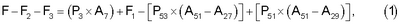 где F обозначает усилие, приложенное к педали, F2 обозначает усилие пружины 116, F3 обозначает усилие пружины 85, P3 обозначает давление в полости 7, А3 обозначает площадь поперечного сечения поршня 95, F1 обозначает усилие возвратной пружины 113, P53 обозначает давление в задней камере 53 усилителя, P51 обозначает давление в передней камере 51 усилителя, А7 обозначает площадь поперечного сечения рабочей полости 7, А51 обозначает площадь поперечного сечения передней камеры 51 и задней камеры 53, А29 обозначает площадь поперечного сечения имеющего относительно небольшой диаметр участка 29 штока 23, а А27 обозначает площадь поперечного сечения имеющего относительно большой диаметр участка 27 штока 23.
