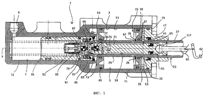 Толкатель 93, предназначенный для механического открытия второго клапана 79, расположенного в управляющем плунжере 59, закреплен на втулке 107, на заднем конце которой имеется буртик, прижатый расположенной в рабочей полости 7 главного тормозного цилиндра пружиной 96 сжатия к торцу 99 поршня главного тормозного цилиндра. Пружина 96 предназначена для возврата гидравлического поршня 95 в исходное положение, которое определяется положением упора 109, который выполнен, например, в виде стопорного пружинного кольца, расположенного в канавке на внутренней поверхности рабочей полости 7, и между которым и задним торцом поршня расположено уплотнение 111, выполненное, например, в виде плоской прокладки. Расположенная между задним торцом втулки 107 и буртиком 115, выполненным на внешней поверхности управляющего плунжера 59, пружина 113 предназначена для возврата управляющего плунжера в исходное положение, которое определяется положением упора 117, выполненного, например, в виде стопорного пружинного кольца, расположенного в канавке на внутренней поверхности задней части отверстия 55 штока 23.