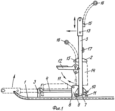Рамка устанавливается на полозья в зоне 2/3 длины, начиная с начала полозьев. Для закрепления рамки на нижних концах стоек предусмотрены, например, башмаки 7 с двумя обушками (передний и задний) с отверстиями, а на полозьях установлены бракеты 8 с соответствующими отверстиями. Переднее крепление 9 шарнирное (болтовое), а заднее 10 быстроразъемное. Для закрепления рамки в различных положениях катания (вертикальное, наклонное вперед или назад), а также для закрепления в сложенном положении на бракетах предусматриваются соответствующие отверстия 11.