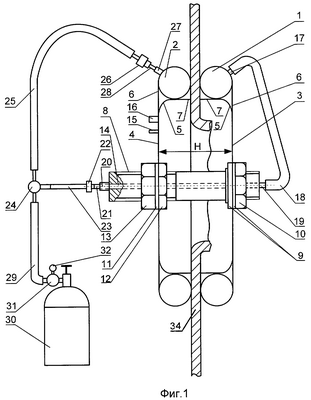 Полая торообразная емкость 1 снабжена штуцером 17, который через гибкий шланг 18 и штуцер 19 соединена с каналом 14 стержня 8. Штуцер 20 стержня 8 снабжен обратным клапаном 21 и с помощью накидной гайки 22 и полого удлинителя 23 соединен с переключающим клапаном 24, который через гибкий шланг 25 с помощью накидной гайки 26 соединен со штуцером 27 полой торообразной емкости 2. Штуцер 27 снабжен обратным клапаном 28. Переключающий клапан 24 через гибкий шланг 29 соединен воздушным баллоном 30, который снабжен редуктором 31 и манометром 32.