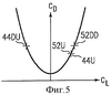 Фиг.5 – график, иллюстрирующий зависимость между коэффициентом аэродинамического сопротивления и коэффициентом подъемной силы для несущей поверхности летательного аппарата, выполненного в соответствии с изобретением.