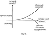 Однако в отношении летательных аппаратов, для которых при совершении эволюции по крену допускается лишь очень незначительный путевой момент, могут потребоваться другие решения. Одним таким решением может быть использование максимального поперечного момента, при котором путевой момент равен нулю, каждый раз, когда требуется совершить эволюцию по крену. Еще одно решение поясняется фиг.7. На фиг.7 представлен график, иллюстрирующий ход отклонения отклоняемой части несущей поверхности, например второй отклоняемой части 44 первой несущей поверхности 40, при совершении эволюции по крену в соответствии с одним из вариантов осуществления изобретения. Как видно из графика, сначала отклоняемая поверхность отклоняется незначительно, после чего наступает циклический режим работы, в котором несущая поверхность отклоняется на величину, обеспечивающую создание отрицательной подъемной силы, и обратно в нейтральное положение несколько раз в секунду. Такой переходный режим может использоваться в диапазоне умеренных изменений углового положения, например, от нескольких градусов в положительном направлении до нескольких градусов в отрицательном. При наличии управляющего сигнала на достижение больших углов крена длительность пребывания отклоняемой несущей поверхности в режиме создания отрицательной подъемной силы во время отработки цикла становится все больше до тех пор, пока несущая поверхность не останется в этом режиме. При задании более глубокого крена аэродинамическая поверхность далее может отклоняться на еще больший угол в режиме создания отрицательной подъемной силы. Фиг.7 отражает поведение органа управления при медленном повороте штурвала с резким возвратом в его нейтральное положение после достижения заданного угла крена. Соответствующая отклоняемая часть несущей поверхности большего размера, например первая отклоняемая часть 52, может отклоняться в аналогичном порядке. Данный циклический режим нельзя использовать для обычных элеронов, так как часть цикла требуется на создание избыточной компенсации.