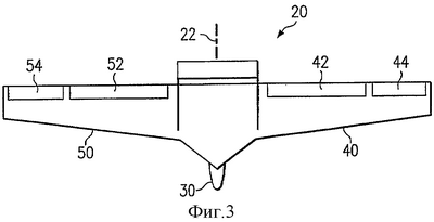 На фиг.3 представлен вид сверху одного варианта самолета 20, выполненного в соответствии с изобретением. Самолет 20 содержит корпус 30, первую несущую поверхность 40 и вторую несущую поверхность 50 (части планера самолета). Первая несущая поверхность 40, которой может быть полукрыло, консоль стабилизатора или управляемая аэродинамическая поверхность любого другого типа, содержит подвижно установленные на ней первую отклоняемую часть 42 и вторую отклоняемую часть 44, которыми могут быть элероны, закрылки, поверхности изменяемого профиля или рулевые поверхности любого другого типа, управляемые для создания прироста и/или уменьшения подъемной силы и аэродинамического сопротивления. Вторая несущая поверхность 50, которой может быть полукрыло, консоль стабилизатора или управляемая аэродинамическая поверхность любого другого типа, содержит подвижно установленные на ней первую отклоняемую часть 52 и вторую отклоняемую часть 54, которыми могут быть элероны, закрылки, поверхности изменяемого профиля или рулевые поверхности любого другого типа, управляемые для создания прироста и/или уменьшения подъемной силы и аэродинамического сопротивления. Отклонение первой отклоняемой части 42 и второй отклоняемой части 44, а также первой отклоняемой части 52 и второй отклоняемой части 54 создают прирост и/или уменьшение подъемной силы с противоположных сторон самолета 20, под действием которых самолет 20 может вращаться относительно продольной оси 22, т.е. выполнять эволюцию по крену.