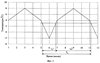 Величина tn зависит также от количества датчиков температур, установленных в зоне. На фиг.2 показаны значения температуры, полученные с датчиков температур 21, 31, 41, 51 61, установленных в зоне 1 РП КА, изображенной на фиг.1. Датчики температур 21 и 61 не участвуют в алгоритме управлении температурами в зоне, не являются элементами обратной связи, а являются информационными датчиками температур, температуры по показаниям подобных датчиков принимаются во внимание при формировании управляющих воздействий. Разница между долей участия датчиков температур в управлении ЭН обуславливает как разницу температур в зонах этих датчиков, так и необходимость уменьшения tn и, как следствие, увеличения количества изменений температур при увеличении количества датчиков температур в зоне для определения температурных зависимостей в самой зоне РП КА.