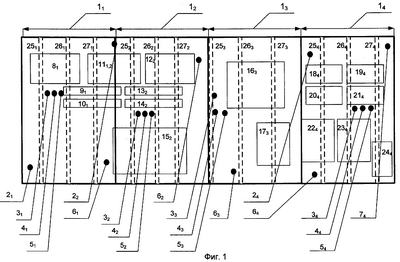 Аналогичным образом пронумерованы приборы и бортовая аппаратура 81, 91, 101 в первой зоне, 111,2 – бортовая аппаратура, расположенная в первой и во второй зоне, и т.д.: 122, 132, 142, 152; 163, 173; 184, 194, 204, 214, 224, 234.