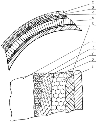 В качестве промежуточно-скрепляющего слоя 10 между поверхностью защищаемого элемента конструкции летательного аппарата и третьим слоем используется материал на основе базальтового и стекловолокна, обладающий высокими термостойкими характеристиками.