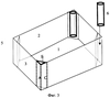 Схема развертки двух одинаковых по размеру листов неметаллического материала толщиной более 5 мм приведена на фиг.2, а на фиг.4 приведен общий вид каркаса тарного ящика, образующегося из указанных разверток непосредственно на поверхности используемого поддона на полозьях.