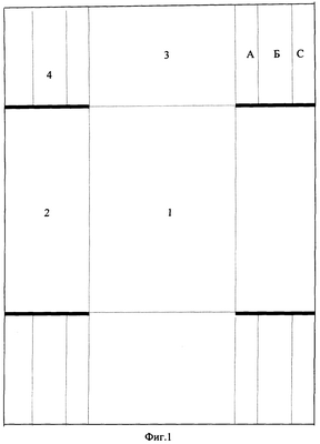 Вначале из неметаллического материала делают заготовку листа длиной, равной суммарной величине высоты и длины изготавливаемого тарного ящика, и шириной, равной суммарной величине высоты и ширины изготавливаемого тарного ящика. Затем, согласно развертке приведенной на фиг.1, производят, путем просечек и перегибов, формирование из заготовки данного листа основных элементов тарного ящика, а именно днища 1, боковых стенок 2 и торцевых стенок 3, связанных линиями перегиба с клапанами 4. После чего из клапанов 4, путем их перегиба, начиная от торцевой стенки делят на три вертикальные полосы А, Б и С, при соотношение ширины их полос как: 1,0:1,41:1,0, формируют стороны вертикальных упрочняющих уголков, располагающихся внутри тарного ящика (см. фиг.3 ), и являющихся одновременно местом жесткого крепления к ним боковых сторон тарного ящика, при этом ширина полосы А равна 0,3 высоты изготавливаемого тарного ящика.