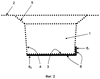 Так, на фиг.1 показан вариант, когда вертикальная часть 61 расположена по всей длине образующей боковой поверхности 4 ячейки 1, а горизонтальная часть 62 расположена лишь на части длины какой-либо хорды донышка 3. При этом угол , как отмечено выше, обычно является нулевым. Он, однако, может отличаться от нуля в ту или другую сторону, как показано на фиг.1а и 1b. На фиг.2 показан противоположный вариант, когда горизонтальная часть 62 расположена на всей длине произвольной хорды донышка 3, а вертикальная часть 61 расположена лишь на части длины образующей боковой поверхности 4 ячейки 1. На фиг.3 показан вариант, когда вертикальная часть 61 расположена по всей длине образующей боковой поверхности 4 ячейки 1 и горизонтальная часть 62 расположена по всей длине произвольной хорды донышка 3. На фиг.4 показан вариант, когда часть 61 расположена на двух образующих боковой поверхности 4 по всей длине этих образующих, часть 62 расположена на всей длине хорды донышка 3 и соединяет части, расположенные на упомянутых образующих.