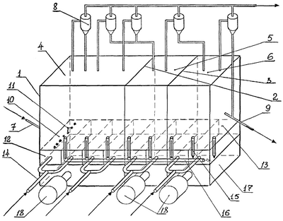 Кроме того, распределитель выполнен в виде вилки и попарно соединен с секциями кессона.