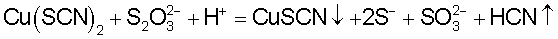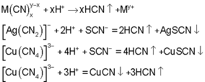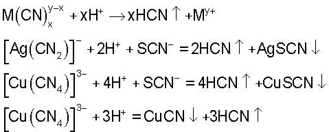 При подкислении растворов происходит не только связывание свободных цианидов в HCN, но и деструкция комплексных цианидов с выделением дополнительного количества HCN и образованием нерастворимых цианидов и тиоцианатов цветных металлов: