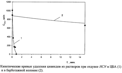 Пример 1. Оборотную воду, содержащую, мг/л: цианиды простые и комплексные -1008.0, тиоцианаты – 1797.0, железо – 96.0, медь – 734.0, цинк – 15.5 и имеющую значение рН 10.4, подкисляли концентрированной серной кислотой до рН 3.7 и направляли для отдувки и поглощения HCN в центробежно-барботажный аппарат (расход жидкости 60-80 л/ч, удельная поверхность контакта фаз 714-920 м2/м3). Интенсивный массообмен приводит к практически полному удалению цианидов из раствора, о чем свидетельствуют следующие значения остаточных концентраций в обработанных растворах: цианиды -1.9 мг/л, тиоцианаты – 1133.0 мг/л, железо – 5.0 мг/л, медь – 106.0 мг/л, цинк – 0.1 мг/л. Время пребывания растворов в реакционной зоне ЦБА составляет менее 1 мин.