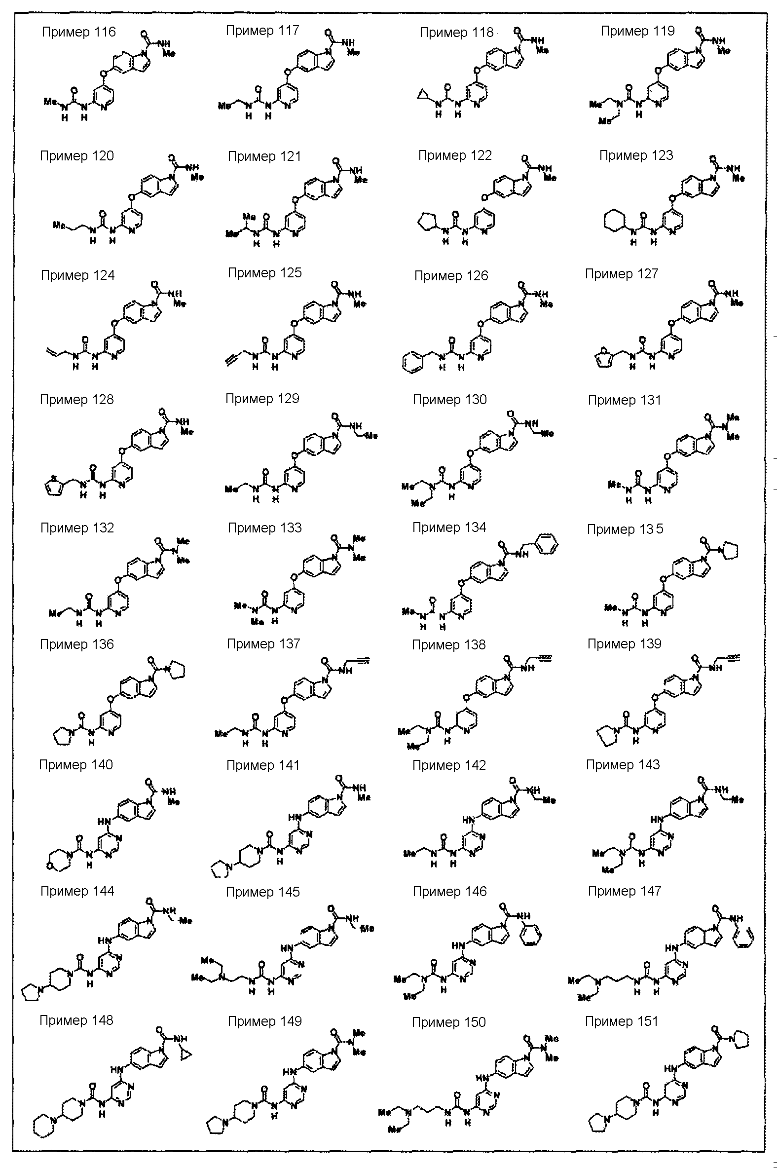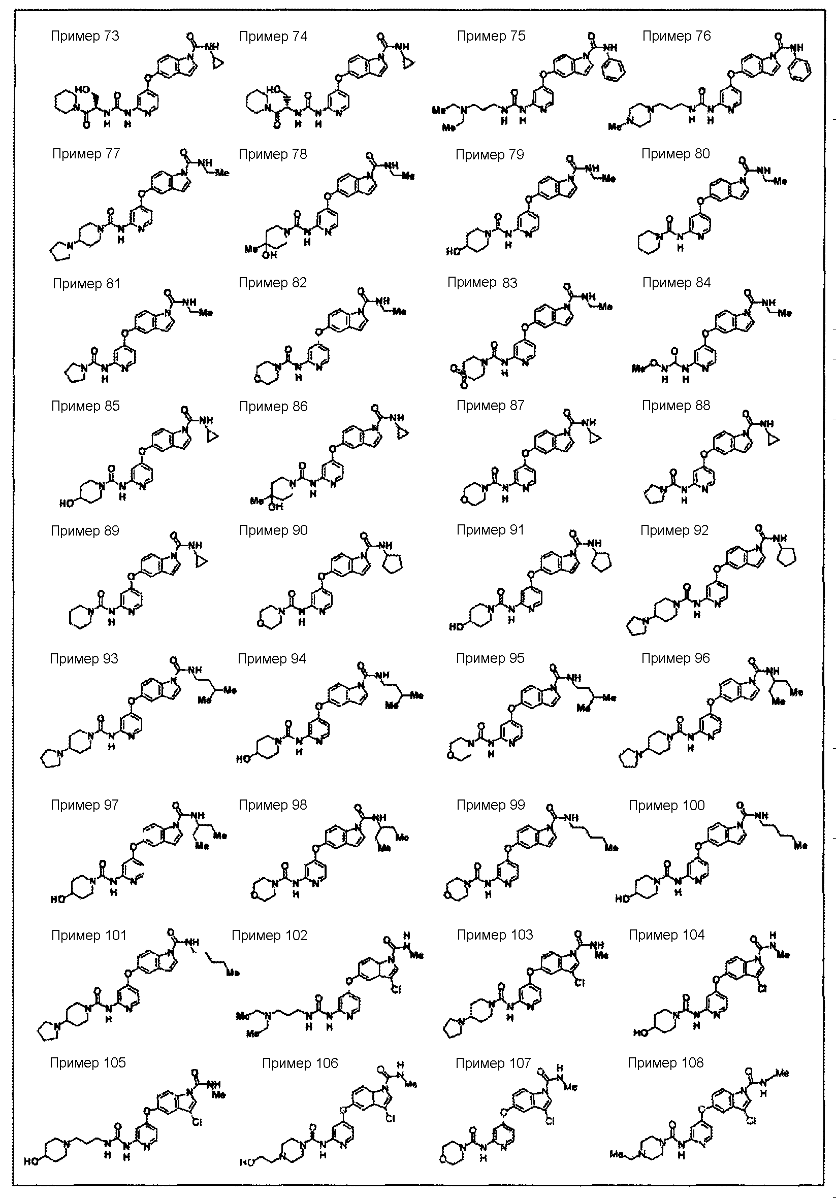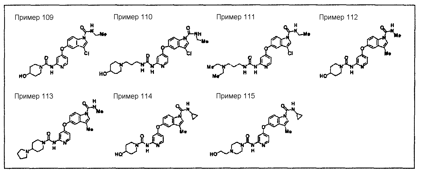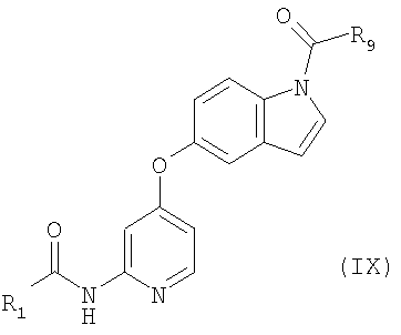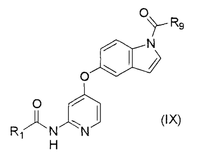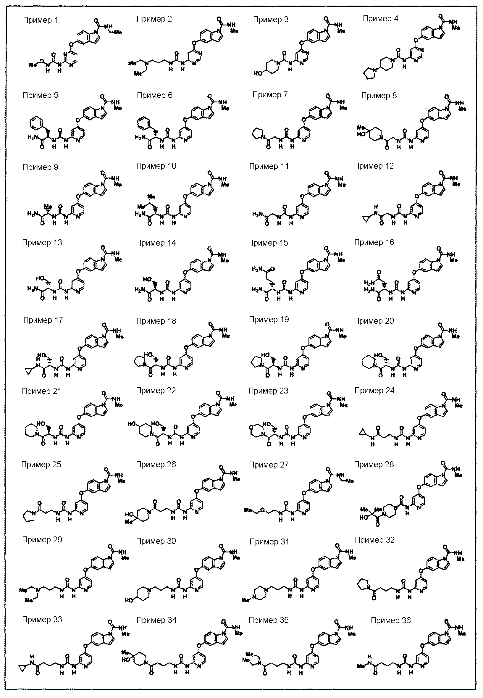 (где e и Z имеют то же значение, что и e и Z в <24> соответственно), и YA3 в формуле (VIII) представляет собой атом водорода; <26> соединение по любому из <1>-<15>, соль соединения или гидрат, где R1 представляет собой группу, представленную формулами (причем каждый из указанных выше членов необязательно замещен группой, выбранной из группы заместителей альфа, где группа заместителей альфа представляет собой группу, состоящую из атома галогена, гидроксильной группы, тиоловой группы, нитрогруппы, цианогруппы, карбоксильной группы, аминогруппы, С1-6алкильной группы, С3-8циклоалкильной группы и группы, представленной формулами (где RN1 и RN2 каждый независимо представляет собой атом водорода или С1-6алкильную группу); <27> соединение по любому из<1>-<15>, соль соединения или гидрат, где R1 представляет собой группу, представленную формулами <28> соединение по любому из <1>-<15>, соль соединения или гидрат, где R1 представляет собой группу, представленную формулами <29> соединение по любому из <1>-<15>, соль соединения или гидрат, где R1 представляет собой группу, представленную формулами <30> соединение по <1> или <2>, соль соединения или гидрат, где соединение представлено общей формулой (где R1 представляет собой группу, представленную формулами (причем каждый из указанных выше членов необязательно замещен группой, выбранной из группы заместителей бета, где группа заместителей бета представляет собой группу, состоящую из гидроксильной группы, С1-6алкильной группы, С3-8циклоалкильной группы и группы, представленной формулами (где RN1 и RN2 каждый независимо представляет собой атом водорода или С1-6алкильную группу)); R9 представляет собой группу, представленную формулой -NHR20 (где R20 представляет собой метильную группу, этильную группу или циклопропильную группу)); <31> соединение по <1>, соль соединения или гидрат, где соединение представляет собой соединение, выбранное из группы, включающей (1) N1-этил-5-(2-((метоксиламино)карбонил)амино-4-пиримидил)окси-1H-индолкарбоксамид, (2) метиламид 5-(6-(3-(3-диэтиламинопропиламино)уреидо)пиримидин-4-илокси)-1H-индол-1-карбоновой кислоты, (3) метиламид 5-(6-(((4-гидроксипиперидин-1-ил)карбонил)амино)пиримидин-4-илокси)-1H-индол-1-карбоновой кислоты, (4) метиламид 5-(6-((4-пирролидин-1-ил)пиперидин-1-ил)карбониламино)пиримидин-4-илокси)-1H-индол-1-карбоновой кислоты, (5) метиламид 5-(2-(3-((1R)-1-карбамоил-2-фенилэтил)уреидо)пиридин-4-илокси)-1H-индол-1-карбоновой кислоты, (6) метиламид 5-(2-(3-((1S)-1-карбамоил-2-фенилэтил)уреидо)пиридин-4-илокси)-1H-индол-1-карбоновой кислоты, (7) метиламид 5-(2-(3-(2-оксо-2-(пирролидин-1-ил)этил)уреидо)пиридин-4-илокси)-1H-индол-1-карбоновой кислоты, (8) метиламид 5-(2-(3-(2-(4-гидрокси-4-метилпиперидин-1-ил)-2-оксоэтил)уреидо)пиридин-4-илокси)-1H-индол-1-карбоновой кислоты, (9) метиламид 5-(2-(3-((1S)-1-карбамоилэтил)уреидо)пиридин-4-илокси)-1H-индол-1-карбоновой кислоты, (10) метиламид 5-(2-(3-((1S)-1-карбамоил-3-метилбутил)уреидо)пиридин-4-илокси)-1H-индол-1-карбоновой кислоты, (11) метиламид 5-(2-(3-карбамоилметилуреидо)пиридин-4-илокси)-1H-индол-1-карбоновой кислоты, (12) метиламид 5-(2-(3-циклопропилкарбамоилметилуреидо)пиридин-4-илокси)-1H-индол-1-карбоновой кислоты, (13) метиламид 5-(2-(3-((1S)-1-карбамоил-2-гидроксиэтил)уреидо)пиридин-4-илокси)-1H-индол-1-карбоновой кислоты, (14) метиламид 5-(2-(3-((1R)-1-карбамоил-2-гидроксиэтил)уреидо)пиридин-4-илокси)-1H-индол-1-карбоновой кислоты, (15) диамид (2S)-2-(3-(4-(1-метилкарбамоил-1H-индол-5-илок