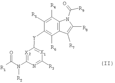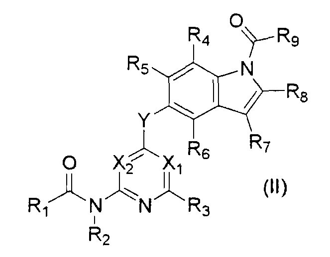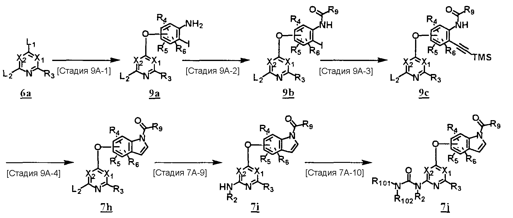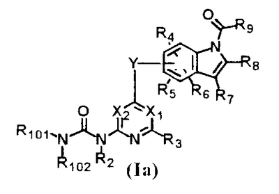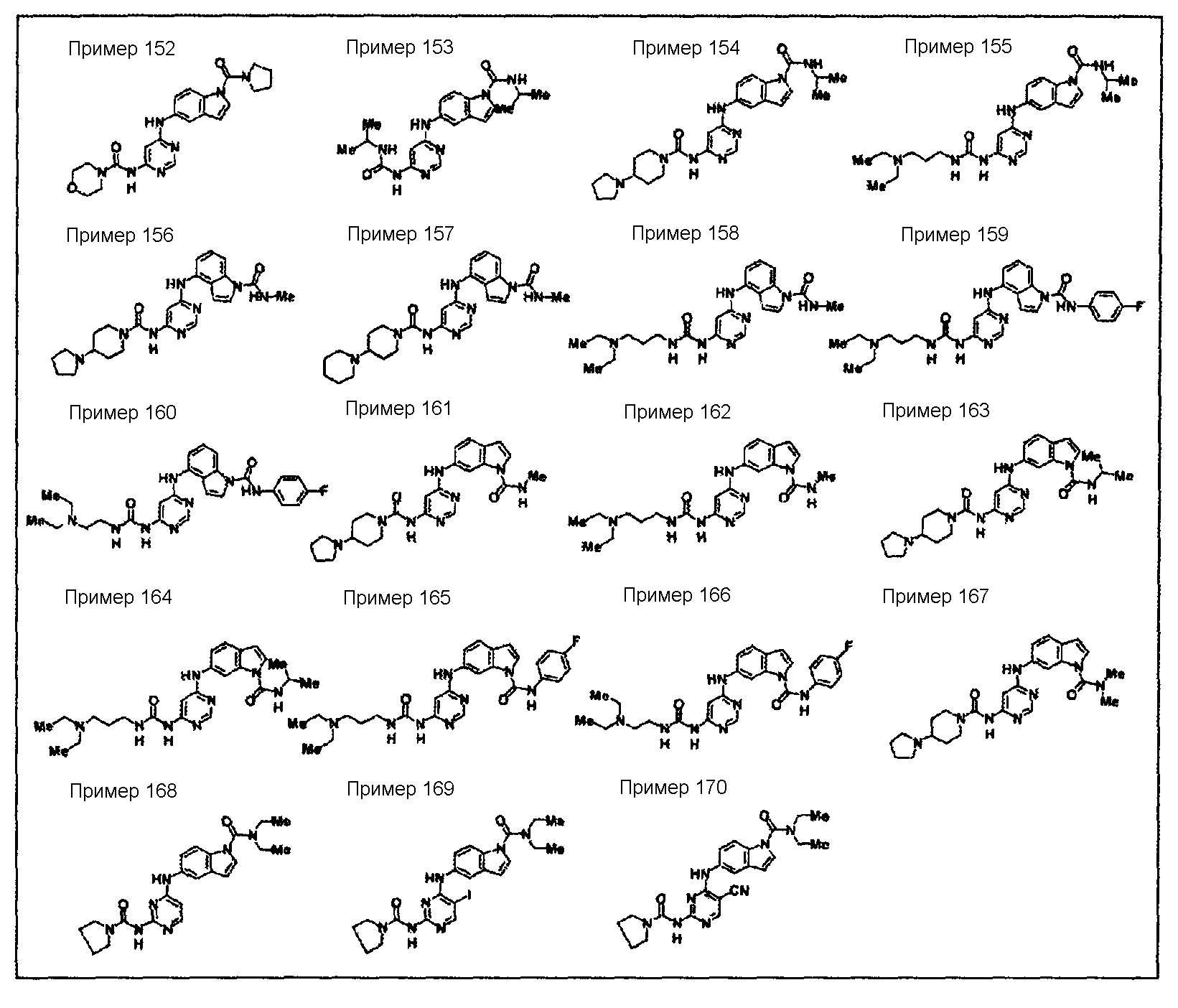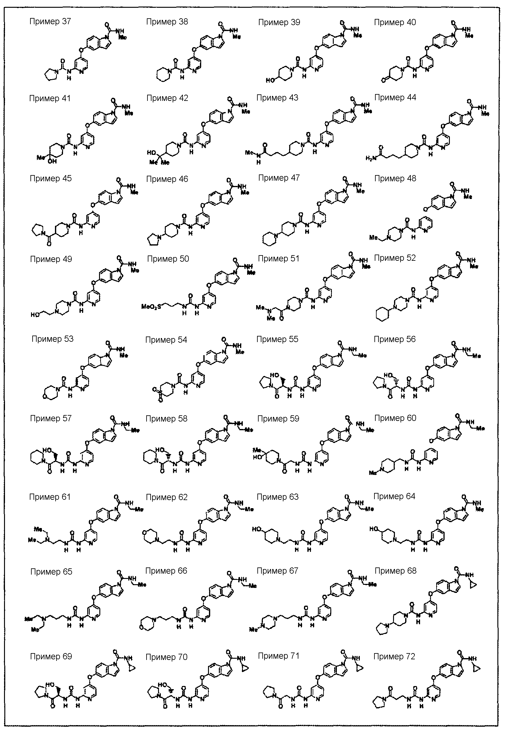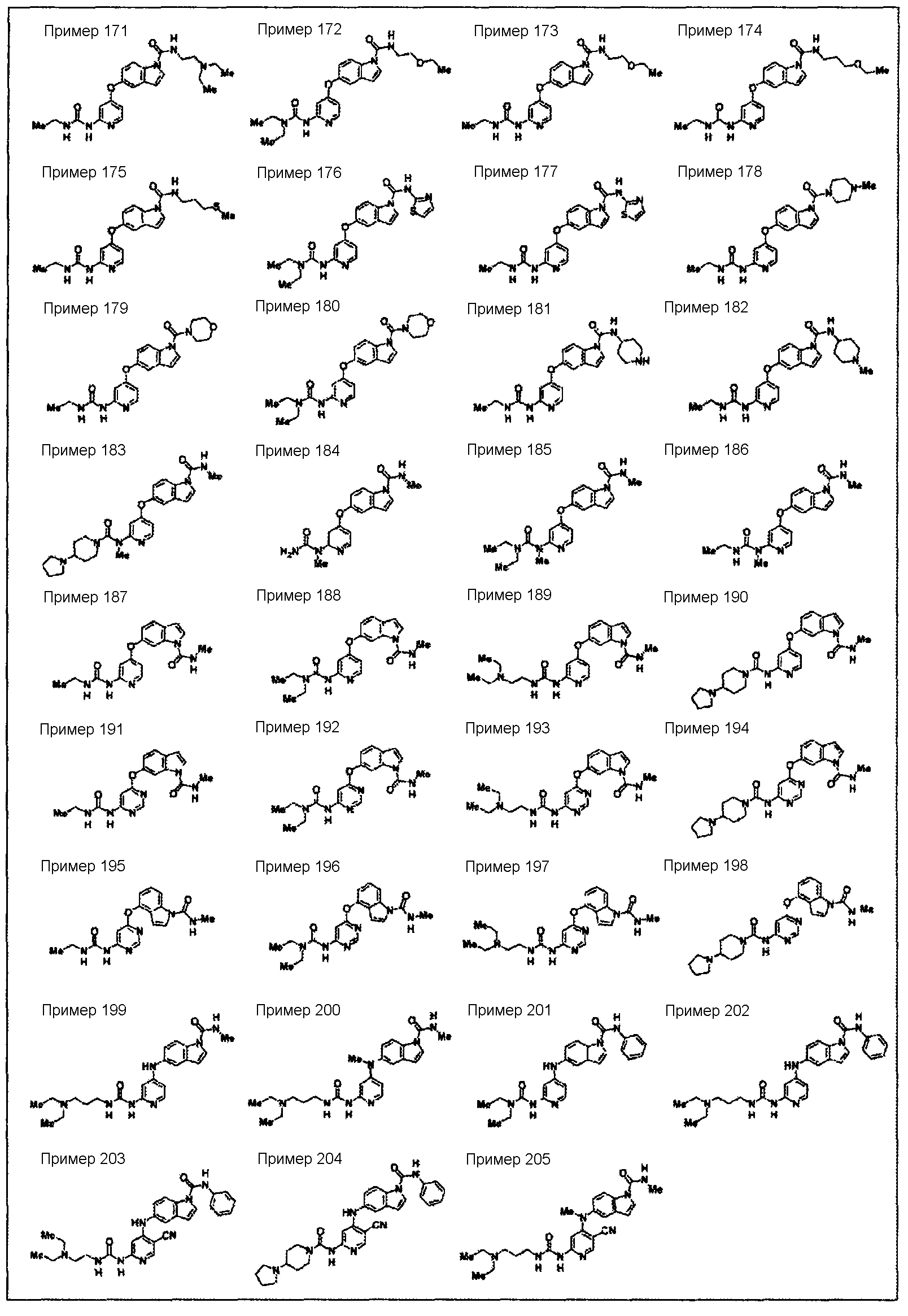 (где e и Z имеют то же значение, что и e и Z в <24> соответственно), и YA3 в формуле (VIII) представляет собой атом водорода; <26> соединение по любому из <1>-<15>, соль соединения или гидрат, где R1 представляет собой группу, представленную формулами (причем каждый из указанных выше членов необязательно замещен группой, выбранной из группы заместителей альфа, где группа заместителей альфа представляет собой группу, состоящую из атома галогена, гидроксильной группы, тиоловой группы, нитрогруппы, цианогруппы, карбоксильной группы, аминогруппы, С1-6алкильной группы, С3-8циклоалкильной группы и группы, представленной формулами (где RN1 и RN2 каждый независимо представляет собой атом водорода или С1-6алкильную группу); <27> соединение по любому из<1>-<15>, соль соединения или гидрат, где R1 представляет собой группу, представленную формулами <28> соединение по любому из <1>-<15>, соль соединения или гидрат, где R1 представляет собой группу, представленную формулами <29> соединение по любому из <1>-<15>, соль соединения или гидрат, где R1 представляет собой группу, представленную формулами <30> соединение по <1> или <2>, соль соединения или гидрат, где соединение представлено общей формулой (где R1 представляет собой группу, представленную формулами (причем каждый из указанных выше членов необязательно замещен группой, выбранной из группы заместителей бета, где группа заместителей бета представляет собой группу, состоящую из гидроксильной группы, С1-6алкильной группы, С3-8циклоалкильной группы и группы, представленной формулами (где RN1 и RN2 каждый независимо представляет собой атом водорода или С1-6алкильную группу)); R9 представляет собой группу, представленную формулой -NHR20 (где R20 представляет собой метильную группу, этильную группу или циклопропильную группу)); <31> соединение по <1>, соль соединения или гидрат, где соединение представляет собой соединение, выбранное из группы, включающей (1) N1-этил-5-(2-((метоксиламино)карбонил)амино-4-пиримидил)окси-1H-индолкарбоксамид, (2) метиламид 5-(6-(3-(3-диэтиламинопропиламино)уреидо)пиримидин-4-илокси)-1H-индол-1-карбоновой кислоты, (3) метиламид 5-(6-(((4-гидроксипиперидин-1-ил)карбонил)амино)пиримидин-4-илокси)-1H-индол-1-карбоновой кислоты, (4) метиламид 5-(6-((4-пирролидин-1-ил)пиперидин-1-ил)карбониламино)пиримидин-4-илокси)-1H-индол-1-карбоновой кислоты, (5) метиламид 5-(2-(3-((1R)-1-карбамоил-2-фенилэтил)уреидо)пиридин-4-илокси)-1H-индол-1-карбоновой кислоты, (6) метиламид 5-(2-(3-((1S)-1-карбамоил-2-фенилэтил)уреидо)пиридин-4-илокси)-1H-индол-1-карбоновой кислоты, (7) метиламид 5-(2-(3-(2-оксо-2-(пирролидин-1-ил)этил)уреидо)пиридин-4-илокси)-1H-индол-1-карбоновой кислоты, (8) метиламид 5-(2-(3-(2-(4-гидрокси-4-метилпиперидин-1-ил)-2-оксоэтил)уреидо)пиридин-4-илокси)-1H-индол-1-карбоновой кислоты, (9) метиламид 5-(2-(3-((1S)-1-карбамоилэтил)уреидо)пиридин-4-илокси)-1H-индол-1-карбоновой кислоты, (10) метиламид 5-(2-(3-((1S)-1-карбамоил-3-метилбутил)уреидо)пиридин-4-илокси)-1H-индол-1-карбоновой кислоты, (11) метиламид 5-(2-(3-карбамоилметилуреидо)пиридин-4-илокси)-1H-индол-1-карбоновой кислоты, (12) метиламид 5-(2-(3-циклопропилкарбамоилметилуреидо)пиридин-4-илокси)-1H-индол-1-карбоновой кислоты, (13) метиламид 5-(2-(3-((1S)-1-карбамоил-2-гидроксиэтил)уреидо)пиридин-4-илокси)-1H-индол-1-карбоновой кислоты, (14) метиламид 5-(2-(3-((1R)-1-карбамоил-2-гидроксиэтил)уреидо)пиридин-4-илокси)-1H-индол-1-карбоновой кислоты, (15) диамид (2S)-2-(3-(4-(1-метилкарбамоил-1H-индол-5-илок