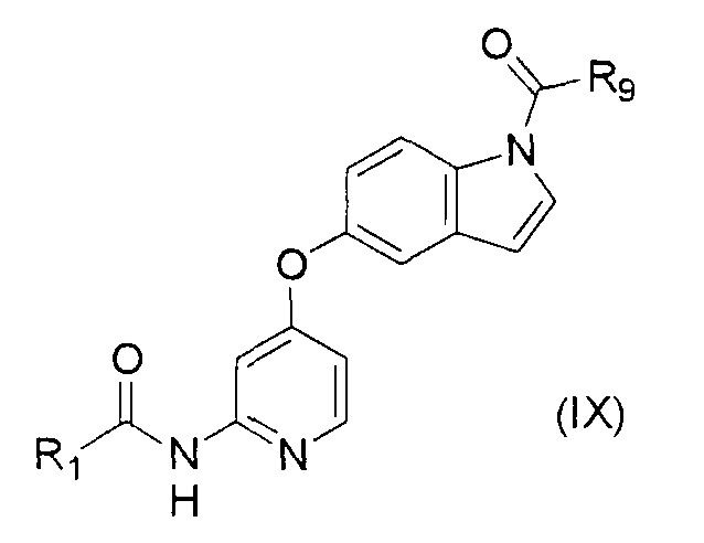 или и R9 представляет собой группу, представленную формулой -NHR20, где R20 представляет собой метильную группу, этильную группу или циклопропильную группу. 15. Соединение по п.1, его соль или гидрат, выбранное из группы, включающей (1) N1-этил-5-(2-((метоксиламино)карбонил)амино-4-пиримидил)окси-1Н-индолкарбоксамид, (2) метиламид 5-(6-(3-(3-диэтиламинопропиламино)уреидо) пиримидин-4-илокси)-1Н-индол-1-карбоновой кислоты, (3) метиламид 5-(6-(((4-гидроксипиперидин-1-ил)карбонил)амино)-пиримидин-4-илокси)-1 Н-индол-1 -карбоновой кислоты, (4) метиламид 5-(6-((4-пирролидин-1-ил)пиперидин-1-ил) карбониламино)пиримидин-4-илокси)-1 Н-индол-1-карбоновой кислоты, (5) метиламид 5-(2-(3-((1R)-1-карбамоил-2-фенилэтил)уреидо)пиридин-4-илокси)-1Н-индол-1-карбоновой кислоты, (6) метиламид 5-(2-(3-((1S)-1-карбамоил-2-фенилэтил)уреидо)пиридин-4-илокси)-1Н-индол-1-карбоновой кислоты, (7) метиламид 5-(2-(3-(2-оксо-2-(пирролидин-1-ил)этил)уреидо) пиридин-4-илокси)-1Н-индол-1-карбоновой кислоты, (8) метиламид 5-(2-(3-(2-(4-гидрокси-4-метилпиперидин-1-ил)-2-оксоэтил)уреидо)пиридин-4-илокси)-1Н-индол-1-карбоновой кислоты, (9) метиламид 5-(2-(3-((1S)-1-карбамоилэтил)уреидо)пиридин-4-илокси)-1Н-индол-1-карбоновой кислоты, (10) метиламид 5-(2-(3-((1S)-1-карбамоил-3-метилбутил)уреидо) пиридин-4-илокси)-1Н-индол-1-карбоновой кислоты, (11) метиламид 5-(2-(3-карбамоилметилуреидо)пиридин-4-илокси)-1Н-индол-1-карбоновой кислоты, (12) метиламид 5-(2-(3-циклопропилкарбамоилметилуреидо)пиридин-4-илокси)-1Н-индол-1-карбоновой кислоты, (13) метиламид 5-(2-(3-((1S)-1-карбамоил-2-гидроксиэтил)уреидо) пиридин-4-илокси)-1Н-индол-1-карбоновой кислоты, (14) метиламид 5-(2-(3-((1R)-1-карбамоил-2-гидроксиэтил)уреидо) пиридин-4-илокси)-1Н-индол-1-карбоновой кислоты, (15) диамид (28)-2-(3-(4-(1-метилкарбамоил-1Н-индол-5-илокси) пиридин-2-ил)уреидо)-1,5-пентандикарбоновой кислоты, (16) (2S)-2-(3-(4-(1-метилкарбамоил-1Н-индол-5-илокси)пиридин-2-ил)уреидо)сукцинамид, (17) метиламид 5-(2-(3-((1S)-1-циклопропилкарбамоил-2-гидроксиэтил) уреидо)пиридин-4-илокси)-1Н-индол-1-карбоновой кислоты, (18) метиламид 5-(2-(3-((1S)-1-гидроксиметил-2-оксо-2-пирролидин-1-илэтил)уреидо)пиридин-4-илокси)-1Н-индол-1-карбоновой кислоты, (19) метиламид 5-(2-(3-((1R)-1-гидроксиметил-2-оксо-2-пирролидин-1-илэтил)уреидо)пиридин-4-илокси)-1Н-индол-1-карбоновой кислоты, (20) метиламид 5-(2-(3-((1S)-1-гидроксиметил-2-оксо-2-пиперидин-1 -илэтил)уреидо)пиридин-4-илокси)-1Н-индол-1-карбоновой кислоты, (21) метиламид 5-(2-(3-((1R)-1-гидроксиметил-2-оксо-2-пиперидин-1-илэтил)уреидо)пиридин-4-илокси)-1Н-индол-1-карбоновой кислоты, (22) метиламид 5-(2-(3-((1S)-1-гидроксиметил-2-(4-гидроксипиперидин-1-ил)-2-оксоэтил)уреидо)пиридин-4-илокси)-1Н-индол-1-карбоновой кислоты, (23) метиламид 5-(2-(3-((1S)-1-гидроксиметил-2-(морфолин-4-ил)-2-оксоэтил)уреидо)пиридин-4-илокси)-1Н-индол-1-карбоновой кислоты, (24) метиламид 5-(2-(3-(2-циклопропилкарбамоилэтил)уреидо) пиридин-4-илокси)-1Н-индол-1-карбоновой кислоты, (25) метиламид 5-(2-(3-(3-оксо-3-(пирролидин-1-ил)пропил)уреидо) пиридин-4-илокси)-1Н-индол-1-карбоновой кислоты, (26) метиламид 5-(2-(3-(3-(4-гидрокси-4-метилпиперидин-1-ил)-3-оксопропил)уреидо)пиридин-4-илокси)-1Н-индол-1-карбоновой кислоты, (27) N1-этил-5-(2-(((2-этоксиэтил)амино)карбонил)амино-4-пиридил)окси-1Н-1-индолкарбоксамид, (28) N1-метил-5-(2-((4-(2-гидрокси-2-метилпропионил)пиперазин-1-ил)карбонил)амино-4-пиридил)окси-1Н-1-индолкарбоксамид, (29) N1-метил-5-(2-((3-(диэтиламино)пропиламино)карбонил)амино-4-пиридил)окси-1Н-1-индолкарбоксамид, (30) N1-метил-5-(2-(((3-(4-гидроксипиперидин)пропил)амино) карбонил)амино-4-пир