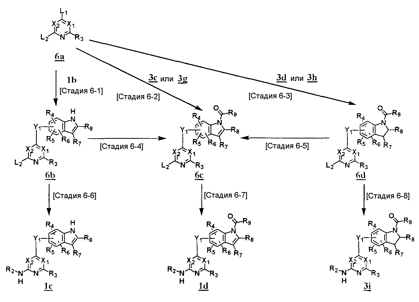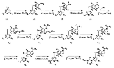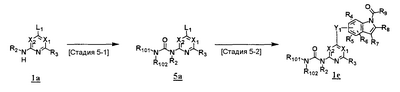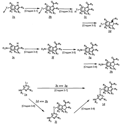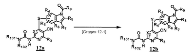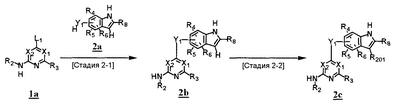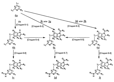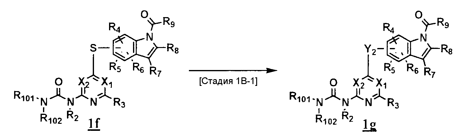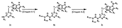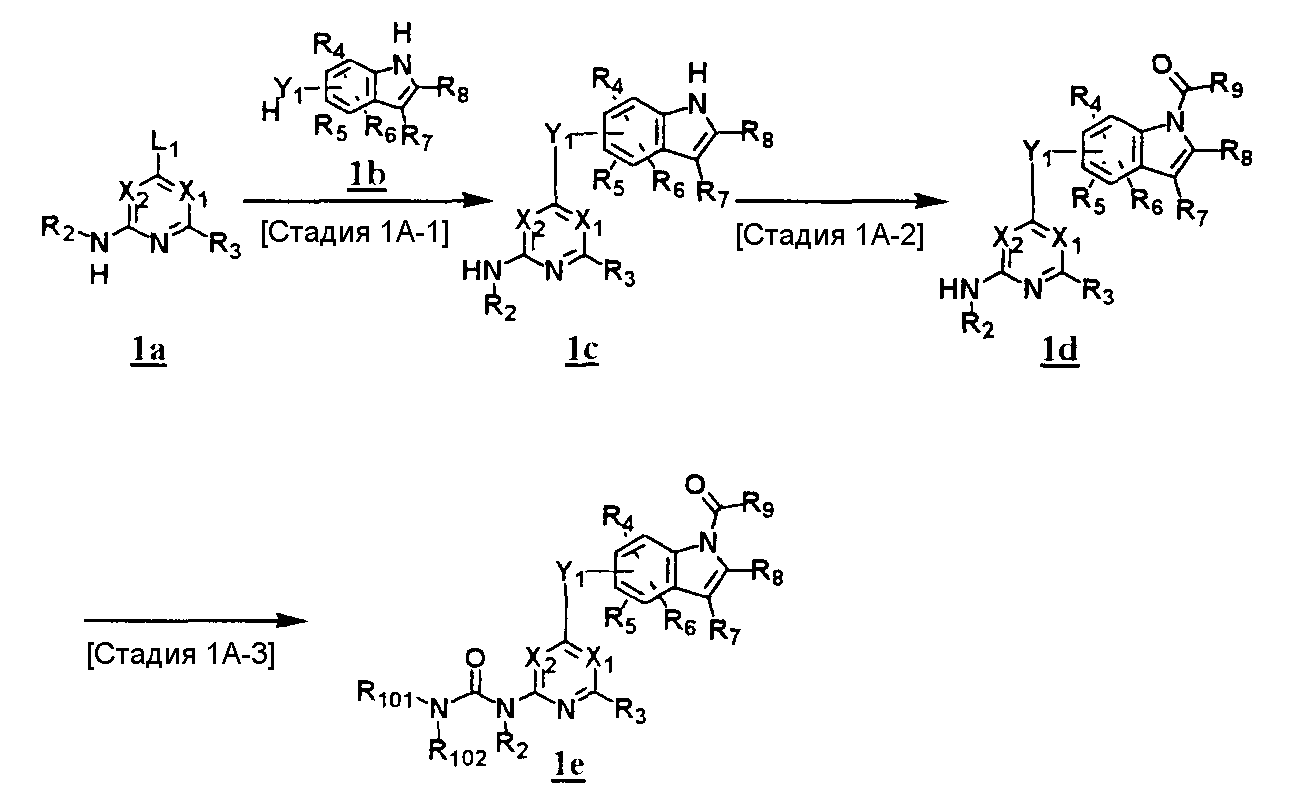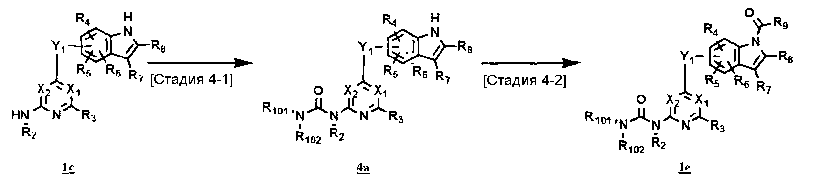 (где T1 определен выше); другие обозначения определены выше. Способ получения 1-A Обычный способ получения соединения (1e), которое представляет собой соединение, представленное формулой (Ia), где Y представляет собой атом кислорода, атом серы или группу, представленную формулой -NRY– (RY представляет собой атом водорода или C1-6алкильную группу) где Y1 представляет собой атом кислорода, атом серы или группу, представленную формулой -NRY1– (RY1 представляет собой атом водорода или C1-6алкильную группу); L1 представляет собой уходящую группу; другие обозначения указаны выше. <Стадия 1A-1> Данная стадия предназначена для получения соединения (1 с) путем конденсации пиримидинового или пиридинового производного (1а), содержащего уходящую группу (L1) в положении 4, с производным индола (1b). В качестве растворителя в реакции может быть использован N-метилпирролидон, N,N-диметилформамид, диметилсульфоксид, 2-этоксиэтанол, хлорбензол или тому подобное. В реакционную смесь может быть добавлено основание или кислота, конкретно могут быть использованы органическое основание, такое как диизопропилэтиламин, неорганическое основание, такое как карбонат калия, карбонат цезия и гидрид натрия, и кислота, такая как пиридингидрохлорид и хлористоводородная кислота. Реакцию можно проводить при температуре, варьирующей от комнатной температуры до температуры кипения с обратным холодильником в течение времени, варьирующего от 10 минут до 30 часов. Кроме того, в качестве исходного вещества может быть использовано соединение, в котором атом галогена, который не является уходящей группой, присоединен к пиримидиновому или пиридиновому кольцу, и после данной стадии атом галогена может быть восстановлен посредством каталитического восстановления или подобного ему. <Стадия 1A-2> Данная стадия предназначена для получения соединения (1d) путем карбоксамидирования положения 1 индола в соединении (1с). В качестве реагента может быть использовано производное карбамата, производное изоцианата, галогенизированное карбамоильное производное или тому подобное. В качестве растворителя для реакции может быть использован хлороформ, толуол, N-метилпирролидон, N,N-диметилформамид, диметилсульфоксид, хлорбензол. В реакционную среду может быть добавлено основание, например органическое основание, такое как пиридин, триэтиламин и диизопропилэтиламин, неорганическое основание, такое как карбонат калия, карбонат цезия и гидрид натрия. Реакцию можно проводить в течение времени от 10 минут до 30 часов при температуре от 0°С до температуры кипения с обратным холодильником. <Стадия 1A-3> Данная стадия предназначена для превращения соединения (1d) в производное мочевины (1e). Сложноэфирное производное карбамата получают с использованием, например, фенилхлоркарбоната или тому подобного. После выделения данного промежуточного соединения или без его выделения промежуточное соединение вводят в реакцию с амином, в результате чего может быть получено производное мочевины. Альтернативно, путем взаимодействия карбаматного производного или изоцианатного производного в качестве реагента оно может быть превращено в соответствующее производное мочевины. В качестве растворителя для реакции может быть использован хлороформ, толуол, N-метилпирролидон, N,N-диметилформамид, диметилсульфоксид, хлорбензол