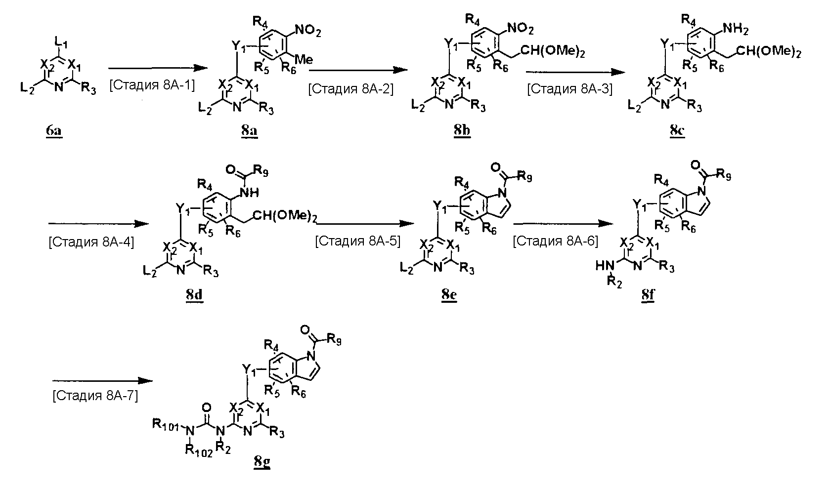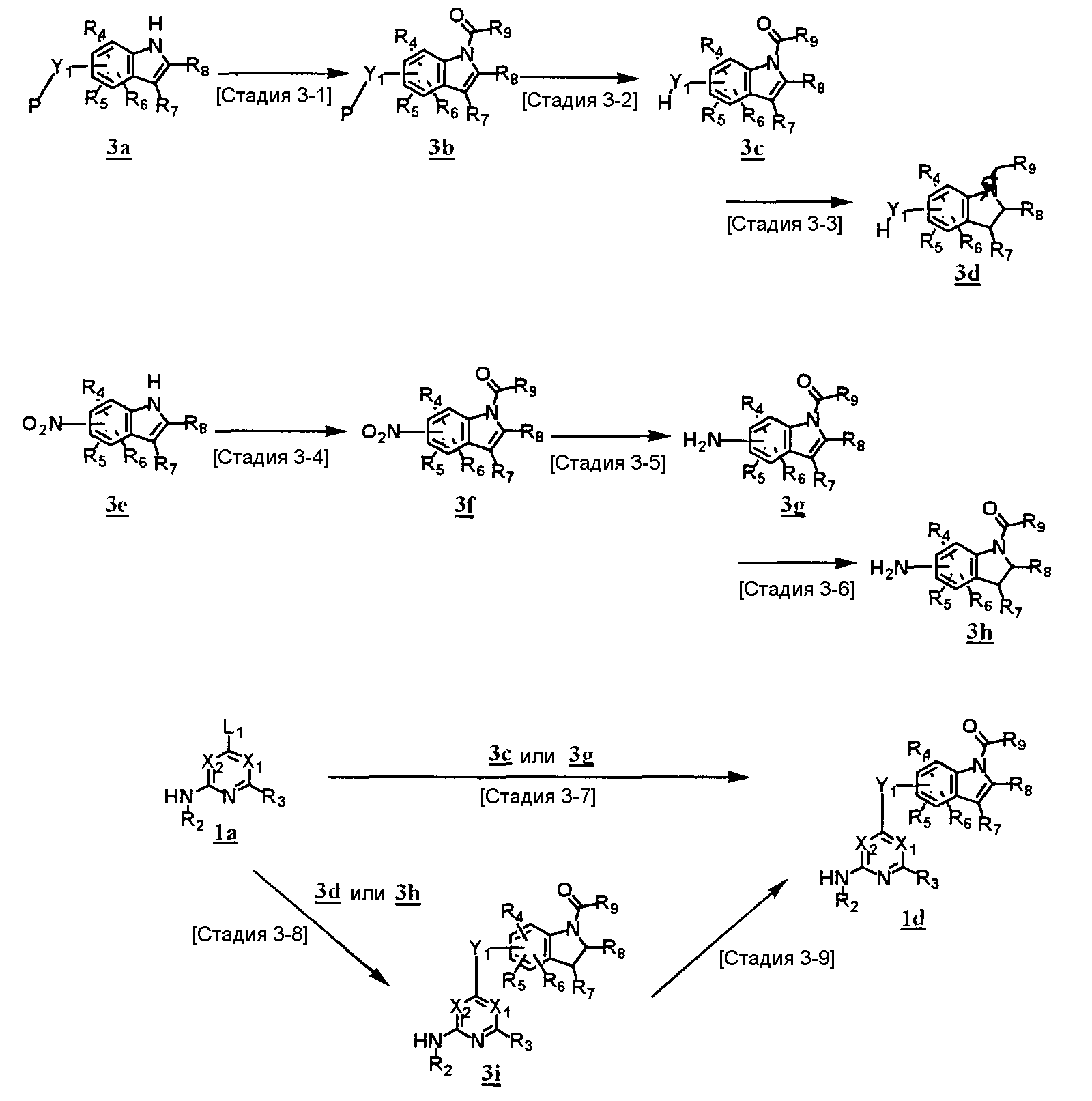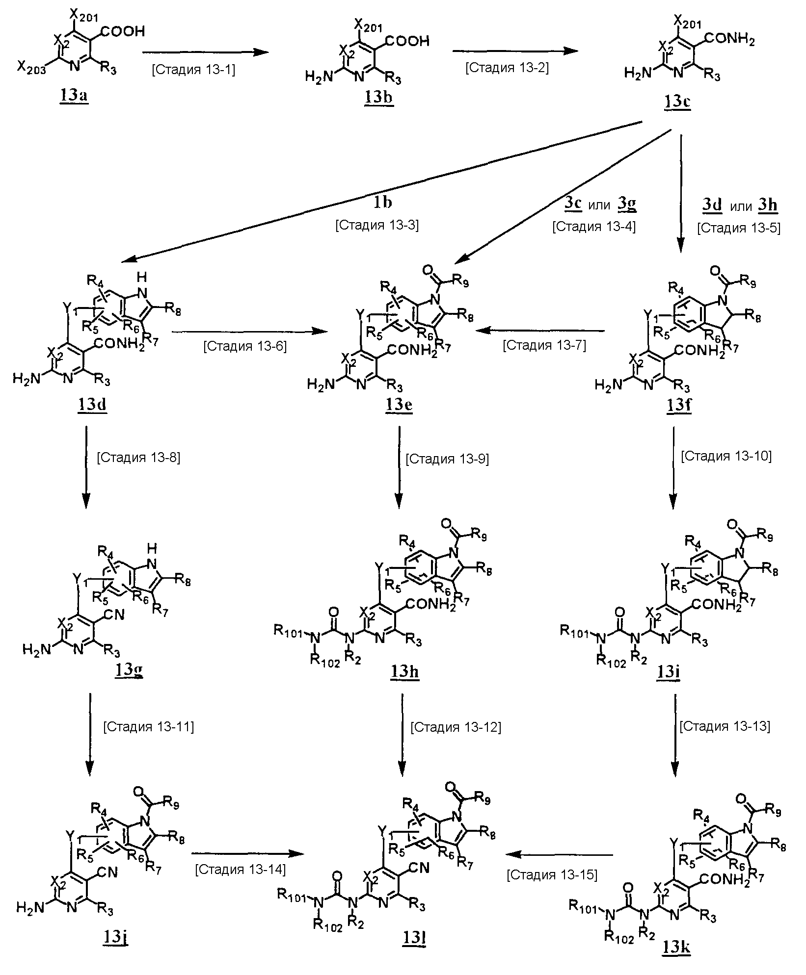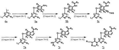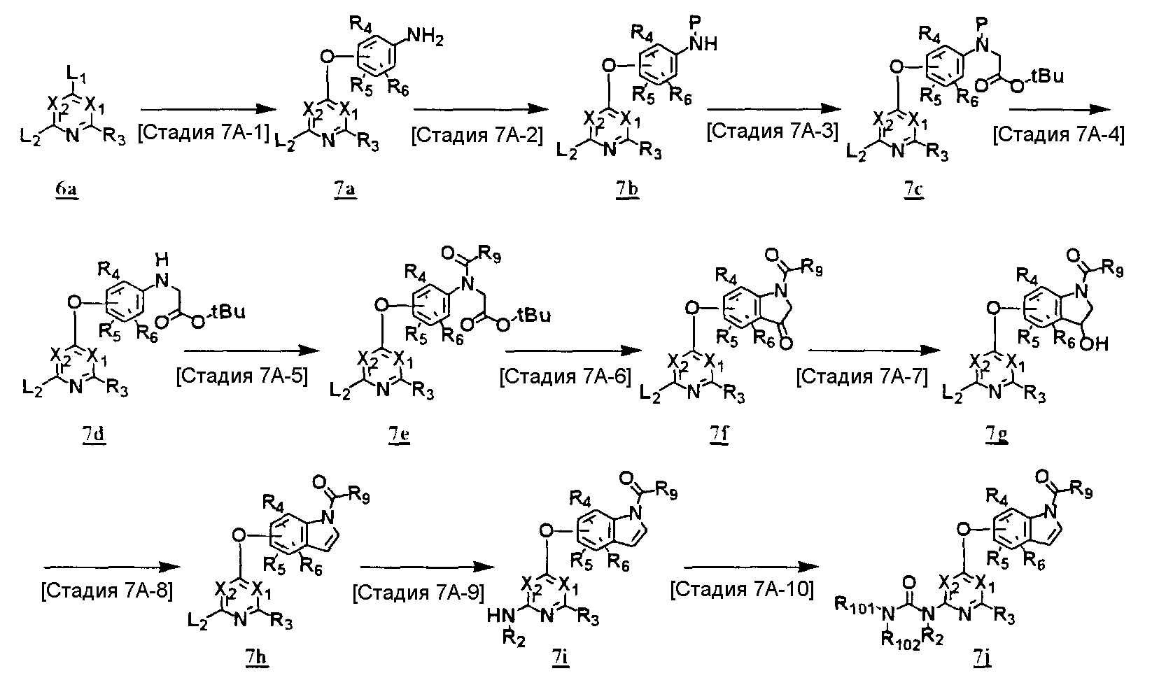 (где T1 определен выше); другие обозначения определены выше. Способ получения 1-A Обычный способ получения соединения (1e), которое представляет собой соединение, представленное формулой (Ia), где Y представляет собой атом кислорода, атом серы или группу, представленную формулой -NRY– (RY представляет собой атом водорода или C1-6алкильную группу) где Y1 представляет собой атом кислорода, атом серы или группу, представленную формулой -NRY1– (RY1 представляет собой атом водорода или C1-6алкильную группу); L1 представляет собой уходящую группу; другие обозначения указаны выше. <Стадия 1A-1> Данная стадия предназначена для получения соединения (1 с) путем конденсации пиримидинового или пиридинового производного (1а), содержащего уходящую группу (L1) в положении 4, с производным индола (1b). В качестве растворителя в реакции может быть использован N-метилпирролидон, N,N-диметилформамид, диметилсульфоксид, 2-этоксиэтанол, хлорбензол или тому подобное. В реакционную смесь может быть добавлено основание или кислота, конкретно могут быть использованы органическое основание, такое как диизопропилэтиламин, неорганическое основание, такое как карбонат калия, карбонат цезия и гидрид натрия, и кислота, такая как пиридингидрохлорид и хлористоводородная кислота. Реакцию можно проводить при температуре, варьирующей от комнатной температуры до температуры кипения с обратным холодильником в течение времени, варьирующего от 10 минут до 30 часов. Кроме того, в качестве исходного вещества может быть использовано соединение, в котором атом галогена, который не является уходящей группой, присоединен к пиримидиновому или пиридиновому кольцу, и после данной стадии атом галогена может быть восстановлен посредством каталитического восстановления или подобного ему. <Стадия 1A-2> Данная стадия предназначена для получения соединения (1d) путем карбоксамидирования положения 1 индола в соединении (1с). В качестве реагента может быть использовано производное карбамата, производное изоцианата, галогенизированное карбамоильное производное или тому подобное. В качестве растворителя для реакции может быть использован хлороформ, толуол, N-метилпирролидон, N,N-диметилформамид, диметилсульфоксид, хлорбензол. В реакционную среду может быть добавлено основание, например органическое основание, такое как пиридин, триэтиламин и диизопропилэтиламин, неорганическое основание, такое как карбонат калия, карбонат цезия и гидрид натрия. Реакцию можно проводить в течение времени от 10 минут до 30 часов при температуре от 0°С до температуры кипения с обратным холодильником. <Стадия 1A-3> Данная стадия предназначена для превращения соединения (1d) в производное мочевины (1e). Сложноэфирное производное карбамата получают с использованием, например, фенилхлоркарбоната или тому подобного. После выделения данного промежуточного соединения или без его выделения промежуточное соединение вводят в реакцию с амином, в результате чего может быть получено производное мочевины. Альтернативно, путем взаимодействия карбаматного производного или изоцианатного производного в качестве реагента оно может быть превращено в соответствующее производное мочевины. В качестве растворителя для реакции может быть использован хлороформ, толуол, N-метилпирролидон, N,N-диметилформамид, диметилсульфоксид, хлорбензол