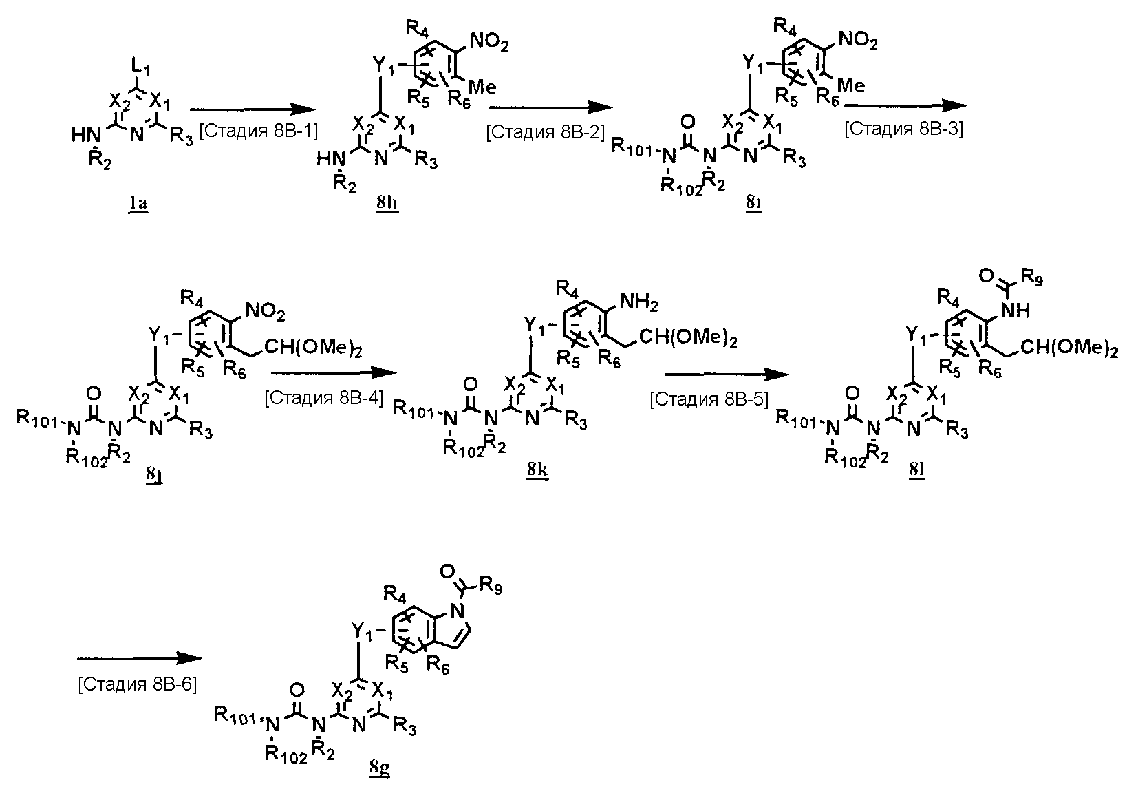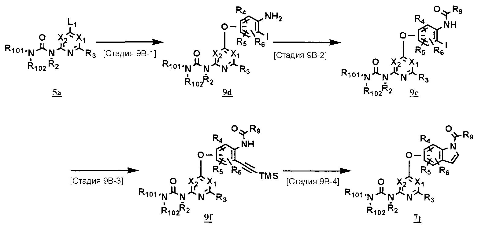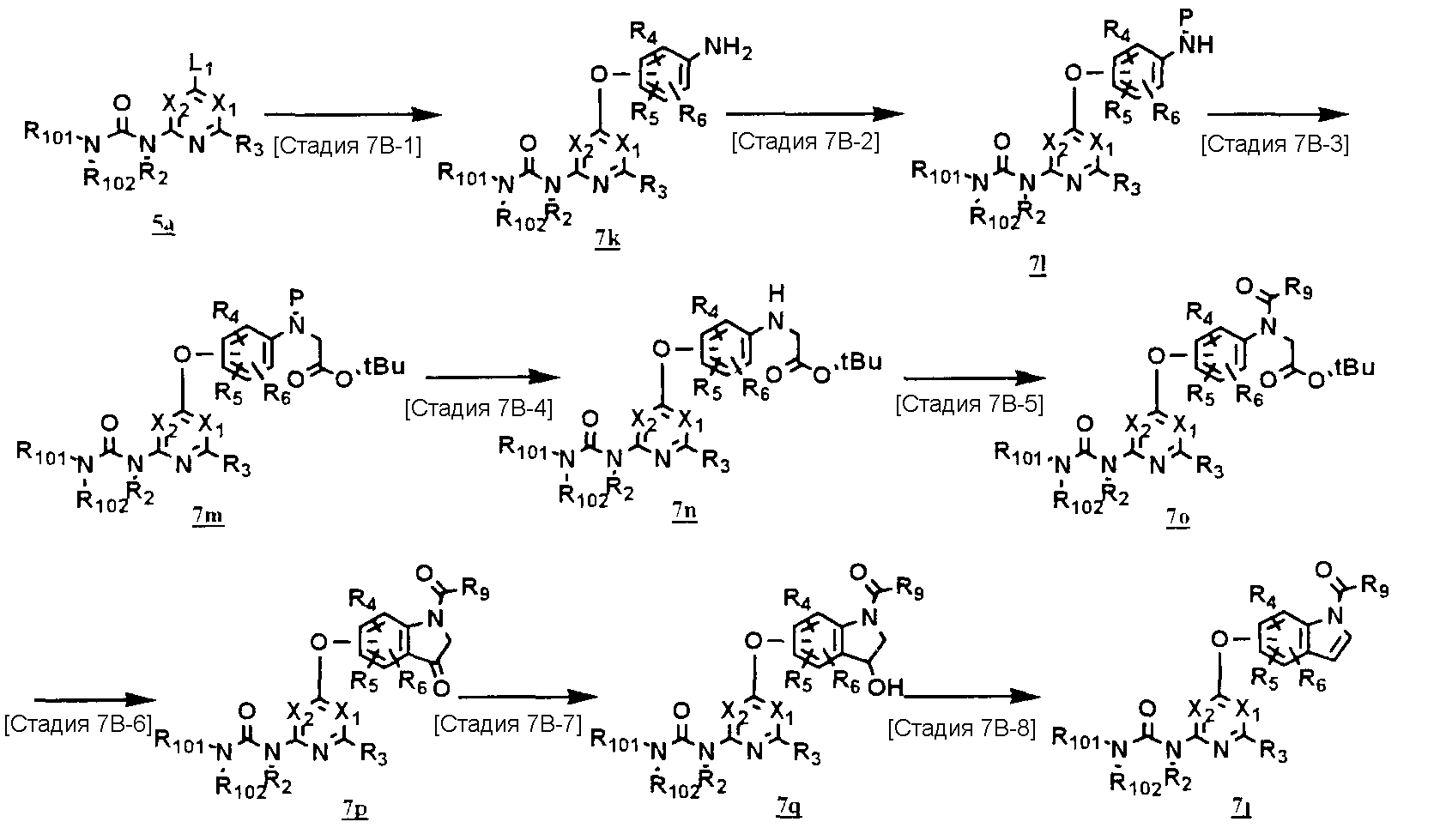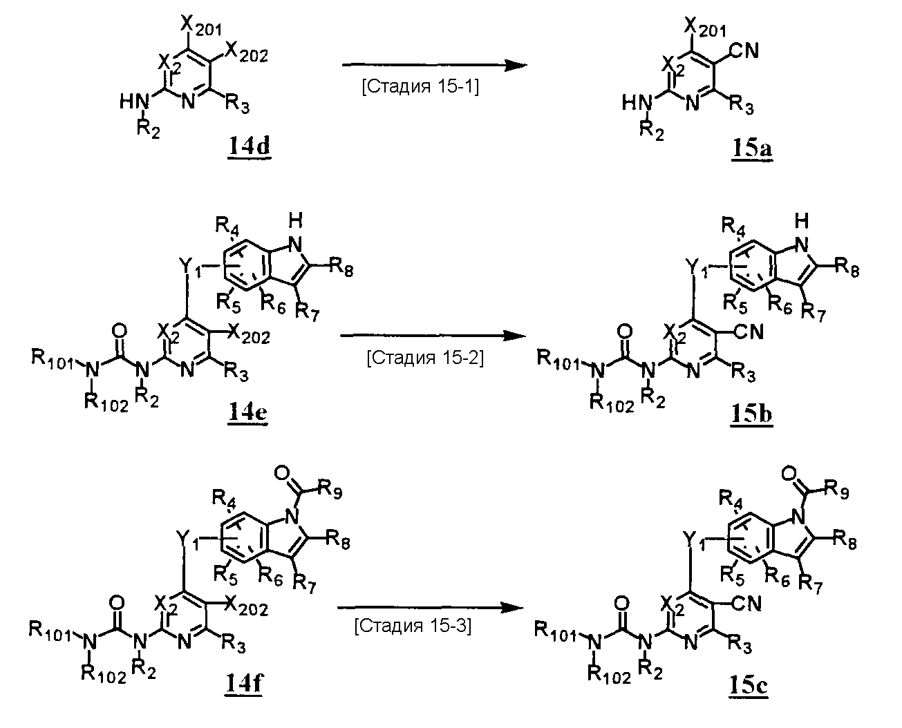 (где T1 определен выше); другие обозначения определены выше. Способ получения 1-A Обычный способ получения соединения (1e), которое представляет собой соединение, представленное формулой (Ia), где Y представляет собой атом кислорода, атом серы или группу, представленную формулой -NRY– (RY представляет собой атом водорода или C1-6алкильную группу) где Y1 представляет собой атом кислорода, атом серы или группу, представленную формулой -NRY1– (RY1 представляет собой атом водорода или C1-6алкильную группу); L1 представляет собой уходящую группу; другие обозначения указаны выше. <Стадия 1A-1> Данная стадия предназначена для получения соединения (1 с) путем конденсации пиримидинового или пиридинового производного (1а), содержащего уходящую группу (L1) в положении 4, с производным индола (1b). В качестве растворителя в реакции может быть использован N-метилпирролидон, N,N-диметилформамид, диметилсульфоксид, 2-этоксиэтанол, хлорбензол или тому подобное. В реакционную смесь может быть добавлено основание или кислота, конкретно могут быть использованы органическое основание, такое как диизопропилэтиламин, неорганическое основание, такое как карбонат калия, карбонат цезия и гидрид натрия, и кислота, такая как пиридингидрохлорид и хлористоводородная кислота. Реакцию можно проводить при температуре, варьирующей от комнатной температуры до температуры кипения с обратным холодильником в течение времени, варьирующего от 10 минут до 30 часов. Кроме того, в качестве исходного вещества может быть использовано соединение, в котором атом галогена, который не является уходящей группой, присоединен к пиримидиновому или пиридиновому кольцу, и после данной стадии атом галогена может быть восстановлен посредством каталитического восстановления или подобного ему. <Стадия 1A-2> Данная стадия предназначена для получения соединения (1d) путем карбоксамидирования положения 1 индола в соединении (1с). В качестве реагента может быть использовано производное карбамата, производное изоцианата, галогенизированное карбамоильное производное или тому подобное. В качестве растворителя для реакции может быть использован хлороформ, толуол, N-метилпирролидон, N,N-диметилформамид, диметилсульфоксид, хлорбензол. В реакционную среду может быть добавлено основание, например органическое основание, такое как пиридин, триэтиламин и диизопропилэтиламин, неорганическое основание, такое как карбонат калия, карбонат цезия и гидрид натрия. Реакцию можно проводить в течение времени от 10 минут до 30 часов при температуре от 0°С до температуры кипения с обратным холодильником. <Стадия 1A-3> Данная стадия предназначена для превращения соединения (1d) в производное мочевины (1e). Сложноэфирное производное карбамата получают с использованием, например, фенилхлоркарбоната или тому подобного. После выделения данного промежуточного соединения или без его выделения промежуточное соединение вводят в реакцию с амином, в результате чего может быть получено производное мочевины. Альтернативно, путем взаимодействия карбаматного производного или изоцианатного производного в качестве реагента оно может быть превращено в соответствующее производное мочевины. В качестве растворителя для реакции может быть использован хлороформ, толуол, N-метилпирролидон, N,N-диметилформамид, диметилсульфоксид, хлорбензол