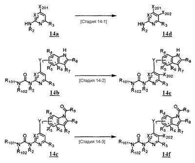 (где T2 представляет собой необязательно замещенный 5-10-членный ароматический гетероцикл или необязательно замещенный 3-10-членный гетероцикл); R2 и R14 каждый независимо представляет собой атом водорода, необязательно замещенную С1-6алкильную группу, необязательно замещенную С2-6алкенильную группу, необязательно замещенную С2-6алкинильную группу, необязательно замещенную С3-8циклоалкильную группу или группу, представленную формулой -CO-R13; R15 представляет собой необязательно замещенную С1-6алкильную группу, необязательно замещенную С2-6алкенильную группу, необязательно замещенную С2-6алкинильную группу, необязательно замещенную С3-8циклоалкильную группу, необязательно замещенную С6-10арильную группу, необязательно замещенную 5-10-членную гетероарильную группу, или необязательно замещенную 3-10-членную гетероциклическую группу; R16a и R16b каждый независимо представляет собой атом водорода, необязательно замещенную С1-6алкильную группу, необязательно замещенную С3-6алкенильную группу, необязательно замещенную С3-6алкинильную группу, необязательно замещенную С3-8циклоалкильную группу, необязательно замещенную С6-10арильную группу, необязательно замещенную 5-10-членную гетероарильную группу, необязательно замещенную 3-10-членную гетероциклическую группу или необязательно замещенную С1-6алкоксигруппу и X представляет собой атом кислорода, атом серы, карбонильную группу, сульфонильную группу, группу, представленную формулой -CRX1RX2-, или группу, представленную формулой -NRX3– (где RX1, RX2 и RX3 каждый независимо представляет собой атом водорода или группу, представленную формулой -A1-A2-A3 (где A1 и A2 каждый независимо представляет собой простую связь, необязательно замещенную С1-6алкиленовую группу или карбонильную группу и A3 представляет собой атом водорода, С3-8циклоалкильную группу, группу, представленную формулой -NRA1RA2, или формулой -ORA3 (где RA1, RA2 и RA3 каждый независимо представляет собой атом водорода или С1-6алкильную группу), или необязательно замещенную группу, представленную формулой