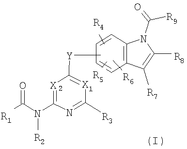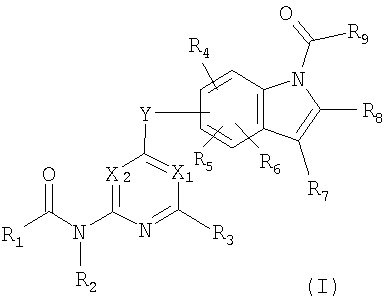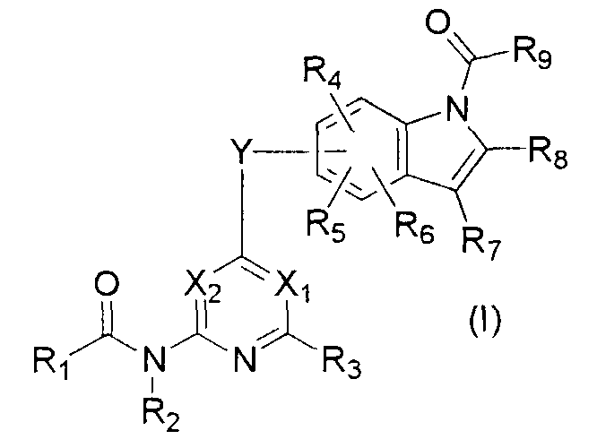 Настоящее изобретение относится к новым соединениям, эффективным для профилактики и лечения различных заболеваний, связанных с аномальным ангиогенезом, и к медицинским композициям, таким как ингибиторы ангиогенеза и противоопухолевые агенты, содержащие новые соединения. Ангиогенез является существенным биологическим феноменом для формирования сосудов плода и морфологического и функционального развития органов. Формирование новых кровеносных сосудов складывается из нескольких процессов, включая миграцию клеток эндотелия, пролиферацию и образование трубки, и, как показано, тучные клетки, лимфоциты, интерстициальные клетки и другие клетки играют важную роль в данном процессе (J. Biol. Chem., 267, 10931, 1992). Идентифицировано множество факторов, стимулирующих ангиогенез in vivo, в частности фактор роста эндотелия сосудов (сокращаемый здесь далее как VEGF) и фактор роста фибробластов (сокращаемый здесь далее как FGF), как сообщается, усиливают ангиогенез (Endocrinology, 133, 848, 1993, and Biochem. Biophys. Res. Commun., 147, 876, 1987). Хотя физиологический ангиогенез происходит во время заживления раны или в женском эстральном цикле у взрослых индивидуумов, известно, что патологическое усиление ангиогенеза у взрослых индивидуумов вовлечено в возникновение или прогрессию различных заболеваний. Конкретные болезни, связанные с аномальным ангиогенезом, включают рак, ревматоидный артрит, атеросклероз, диабетическую ретинопатию, ангиому, псориаз и тому подобное (N. Engl. J. Med., 333, 1757, 1995). В частности, в литературе указывается на зависимость роста солидных опухолей от ангиогенеза, и ингибиторы ангиогенеза являются, следовательно, перспективными в качестве новых терапевтических агентов для воздействия на солидные опухоли (J. Natl. Cancer Inst., 82, 4, 1990). Патентная литература (WO 02/16348 и WO 02/32872) предлагается как иллюстрация предшествующего уровня техники в отношении 6-членных азотсодержащих ароматических производных, связанных с замещенным индолом. Хотя WO 02/16348 описывает производные индола, которые подавляют стимулированный VEGF ангиогенез благодаря селективному ингибированию тирозинкиназы, результаты фармакологических тестов их ингибирующего действия не раскрыты. Несмотря на то, что WO 02/32872 описывает производные пиридина, связанные с индольным кольцом через атом кислорода в 4 положении, ни соединение по настоящему изобретению, ни его ингибирующее действие на ангиогенез, стимулированный FGF, не раскрыты. Описание изобретения Задачей настоящего изобретения является исследование и раскрытие соединений, ингибирующих ангиогенез, которые (1) проявляют противоопухолевую активность путем существенного подавления ангиогенеза, индуцируемого как VEGF, так и FGF, которые являются главными факторами ангиогенеза in vivo, (2) и являются пригодными в качестве лекарственных средств в плане их свойств, биокинетики и безопасности, и (3) пригодны для облегчения, предотвращения и лечения различных заболеваний, связанных с аномальным усилением ангиогенеза. В результате очень упорных исследований изобретатели настоящего изобретения успешно синтезировали новые пиридиновые производные и пиримидиновые производные, представленные следующей общей формулой (I), их соли или гидраты. Показано, что данные соединения, их соли или гидраты оказывают прекрасный ингибирующий ангиогенез эффект. Конкретно в настоящем и