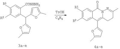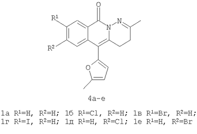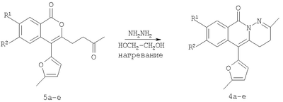 1. Способ синтеза гетероциклических соединений – производных пиридазино[1,6-b]изохинолона общей формулы 4а-е, включающий последовательность трех реакций: а) алкилирование производных 2-ди(5-метил-2-фурил)метилбензойной кислоты 1а-е метил йодидом с образованием соответствующих сложных эфиров 2а-е при комнатной температуре в сухом димстилсульфоксиде при избытке метил йодида в присутствии гидроксида калия, б) гидразинолиз сложных эфиров 2а-е с образованием соответствующих гидразидов 3а-е путем взаимодействия сложных эфиров общей формулы 2а-е с гидразином, в) кислотно-катализируемая рециклизация гидразидов 3а-е в производные пиридазино[1,6-b]изохинолонов 4а-е путем кипячения исходных гидразидов 3а-е в безводном растворе толуолсульфокислоты в бензоле. 2. Способ синтеза производных пиридазино[1,6-b]изохинолона общей формулы 4а-е включающий превращение кетонов 5а-е в производные пиридазино[1,6-b]изохинолона 4а-е путем добавления гидразин гидрата при комнатной температуре в раствор соответствующего кетона 5а-е в этиленгликоле с последующим кипячением полученной реакционной смеси в течение 10-20 мин.