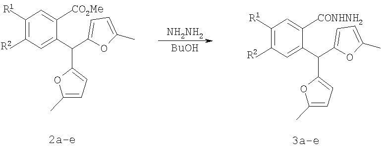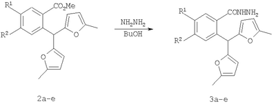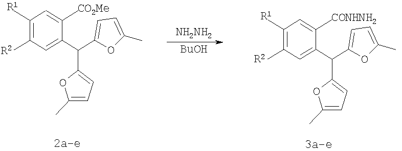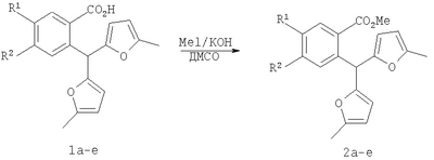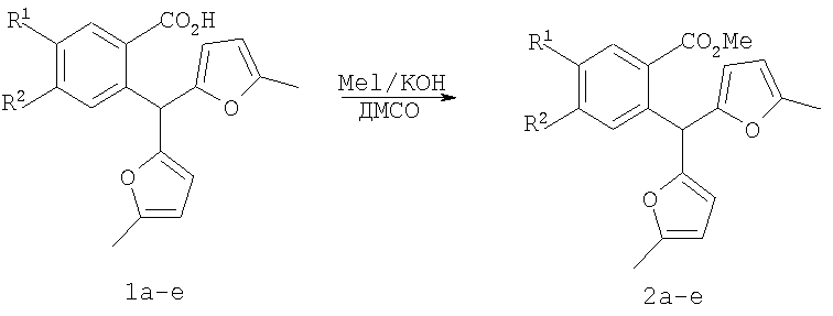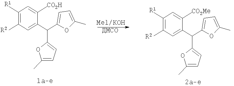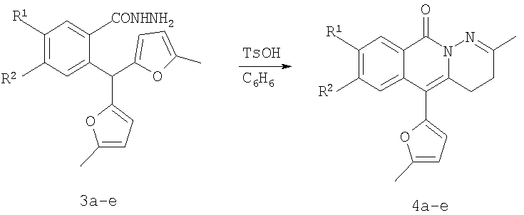 Вероятно, это связано с отсутствием приемлемых методов синтеза веществ этого класса. Известны способы синтеза различных бензанелированных гетероциклических IV систем на основе реакции рециклизации орто-функционализированных бензилфуранов III [В.Т.Абаев, А.В.Гутнов, А.В.Бутин, Химия гетероциклич. соедин., 1998, 603; А.V.Butin, Т.A.Stroganova, I.V.Lodina and G.D.Krapivin, Tetrahedron Lett., 2001, 42, 2031; В.Т.Абаев, А.А.Осипова, А.В.Бутин, Химия гетероциклич. соедин., 2001, 849; А.V.Gutnov, V.T.Abaev, A.V.Butin and A.S.Dmitriev, J. Org. Chem., 2001, 66, 8685; А.V.Butin, V.Т.Abaev, V.V.Mel Использование этой стратегия лежит в основе заявляемого способа синтеза производных пиридазино[1,6-b]изохинолона общей формулы 4а-е. Техническим результатом является синтез ранее недоступных производных пиридазино[1,6-b]изохинолона 4а-е для расширения арсенала веществ, обладающих потенциальной биологической активностью. Технический результат достигается реализацией любого из двух вариантов синтеза производных пиридазино[1,6-b]изохинолона 4а-е. Первый вариант включает последовательность из трех реакций. а) Алкилирование производных 2-ди(5-метил-2-фурил)метилбензойной кислоты 1а-е метил йодидом с образованием соответствующих сложных эфиров 2а-е при комнатной температуре в сухом диметилсульфоксиде при избытке метил йодида в присутствии гидроксида калия. б) Гидразинолиз сложных эфиров 2а-е с образованием соответствующих гидразидов 3а-е путем взаимодействия сложных эфиров общей формулы 2а-е с гидразином. в) Кислотно-катализируемая рециклизация гидразидов 3а-е в производные пиридазино[1,6-b]изохинолона 4а-е путем кипячения исходных гидразидов 3а-е в безводном растворе толуолсульфокислоты в бензоле. Второй вариант включает химическое превращение кетонов 5а-е, получаемых по известному методу из бензойных кислот 1a-e [V.T.Abaev, A.S.Dmitriev, A.V.Gutnov, S.A.Podelyakin, A.V.Butin, Journal of Heterocyclic Chemistry, 2006, 43, №4], в производные пиридазино[1,6-b]изохинолона 4а-е. Реакция осуществляется путем добавления гидразин гидрата при комнатной температуре в раствор соответствующего кетона 5а-е в этиленгликоле с последующим кипячением полученной реакционной смеси в течение 10-20 минут. Индивидуальность и строение синтезированных соединений 4а-е подтверждены данными ПМР спектроскопии и элементного анализа. Пример осуществления заявляемого способа синтеза производных 2-метил-5-(5-метил-2-фурил)-4,10-дигидро-3H-пиридазино[1,6-b]изохинолин-10-она 4а-е по первому варианту. Метил 2-ди(5-метил-2-фурил)метилбензоат (2а) К суспензии 2 г растертого в порошок гидроксида калия в 40 мл сухого диметилсульфоксида добавляют 2 г (6,76 ммоль) 2-ди(5-метил-2-фурил)метилбензойной кислоты, 2 см3 (12,12 ммоль) йодистого метила и перемешивают при комнатной температуре 20 минут. Затем суспензию отфильтровывают от гидроксида калия. Полученный раствор выливают в 500 см3 воды, рН эмульсии доводят до 5-6 разбавленным раствором соляной кислоты и экстрагируют несколько раз хлористым метиленом. Экстракт промывают водой, сушат над сульфатом натрия, добавляют петролейный эфир и чистят методом флэш-хроматографии на силикагеле. Очищенный раствор упаривают до 10-20 мл и оставляют кристаллизоваться при температуре ниже 0°С. Выход соединения 2а 1,8 г (86%). Тпл.=57-58°С. Найдено для С19H18О4, %: С 73.58; Н 5.81. Вычислено: С 73.53; Н 5.85. ПМР спектр (250 МГц, CDCl3): 2,24 (с, 6Н, СН3); 3,86 (с, 3Н, ОСН3); 5,83 (д, 2Н, J=3,3, 4-HFur); 5,86 (д, 2Н, J=3,3, 3-НFur); 6,52 (с, 1Н, СН); 7,27-7,34 (м, 2Н, НAr); 7,42-7,48 (м, 1Н, НAr); 7,89-7,92 (м, 1Н, НAr). 2-Ди(5-мети