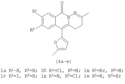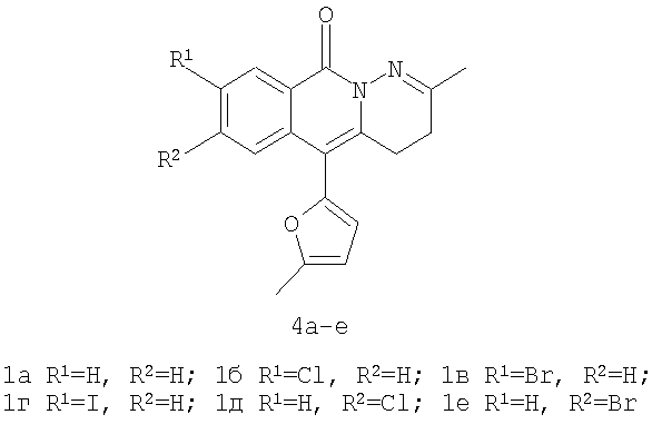 Изобретение относится к области органической химии – способу синтеза производных пиридазино[1,6-b]изохинолонов общей формулы 4а-е. Структура пиридазино[1,6-b]изохинолона общей формулы 4а-е имеет ряд фармакофорных составляющих: конденсированная гетероциклическая система, два атома азота со свободными электронными парами, конформационнофиксированная по отношению к цепочке двух атомов азота карбонильная группа, фурильный заместитель. Поэтому пиридазино[1,6-b]изохинолоны 4а-е рассматриваются как потенциальные биологически активные вещества. Вещества, содержащие в своей структуре пиридазино[1,6-b]изохинолиноновую систему, практически не изучены. В литературе имеется лишь два примера подобных веществ – I [S.Veeraraghavan, F.D.Popp, J.Heterocycl Chem, 1981, 18, 71] и II [Dusemund J., Archiv der Pharmazie, 1982, 315 (11), 925].