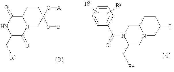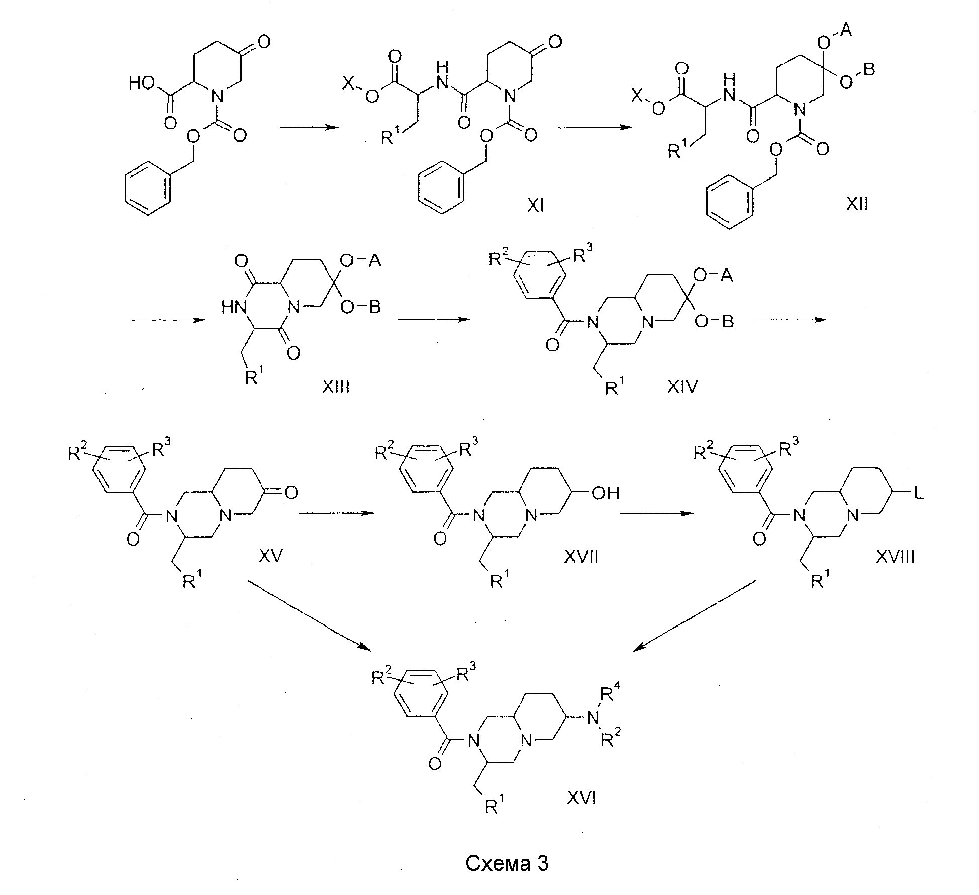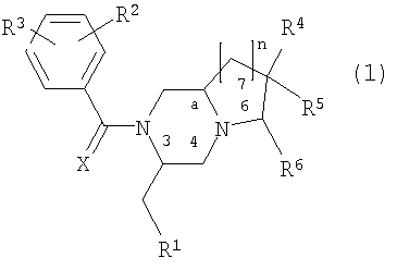 где R1 представляет фенил, 3-индолил или бензо[b]тиофен-3-ил, указанная фенильная группа может быть замещена галогеном; R2 и R3 независимо представляют галоген, СН3 или CF3; R4 представляет Н, ОН, СН2ОН, NH2, диалкил(1-3С)N, пирролидин-1-ил, пиперидин-1-ил, морфолин-4-ил или морфолин-4-ил, замещенный одной или двумя метальными или метоксиметильными группами, морфолин-4-иламино, морфолин-4-илметил, имидазол-1-ил, тиоморфолин-4-ил, 1,1-диоксотиоморфолин-4-ил или 3-окса-8-азабицикло[3.2.1]окт-8-ил; R5 представляет Н, или R4 и R5 вместе могут представлять кетогруппу 1,3-диоксан-2-ил или 1,3-диоксолан-2-ил; R6 представляет Н, морфолин-4-ил, замещенный метильной группой, или СН2ОН, указанная группа СН2ОН может образовывать сложный эфир с органической кислотой; n имеет значения 1 или 2; Х – представляет О; а является асимметричным атомом углерода 8а или 9а, когда n равно 1 или 2 соответственно, и их фармацевтически приемлемые соли, включая все возможные стереоизомеры, в которых заместители у асимметричных атомов углерода 3 и “а”, а также у потенциально асимметричных атомов углерода 6 и 7, находятся в R-конфигурации или в S-конфигурации. 2. Соединения по п.1, имеющие формулу (1), где R1 представляет 3-индолил, R2 и R3 являются группами CF3 в положениях 3 и 5, и остальные символы имеют значения, указанные в п.1, включая все возможные стереоизомеры, как определено в п.1. 3. Соединения по п.2, имеющие формулу (1), в которых R4 представляет морфолин-4-ил или морфолин-4-ил, замещенный одной или двумя метальными или метоксиметильными группами, морфолин-4-иламино, морфолин-4-илметил или СН2OH; R6 представляет морфолин-4-илметил или СН2ОН, указанная группа СН2ОН может образовывать сложный эфир с органической кислотой; R5 представляет водород, и стереохимией которых является 3R. 4. Соединения, имеющие формулу (3) или (4) где R1, R2 и R3 имеют значения, приведенные в п.1, А и В представляют циклический или ациклический кеталь и L представляет уходящую группу, такую как хлор, бром или метансульфонат, используемые в синтезе соединений, имеющих формулу (1). 5. Фармацевтические композиции для лечения заболеваний, в которые вовлечены нейрокинины, которые взаимодействуют с рецепторами NK1, например вещество Р, или которые могут лечиться путем манипуляций с такими рецепторами, содержащие фармакологически активное количество по меньшей мере одного соединения по любому из пп.1-3 в качестве активного ингредиента. 6. Применение соединения по одному из пп.1-3 для изготовления фармацевтической композиции для лечения заболеваний, в которые вовлечены нейрокинины, которые взаимодействуют с рецепторами NK1, например вещество Р, или которые могут лечиться путем манипуляций с такими рецепторами. 7. Применение по п.6, отличающееся тем, что указанными заболеваниями являются острые и хронические боли, рвота, воспалительные заболевания и расстройства центральной нервной системы.