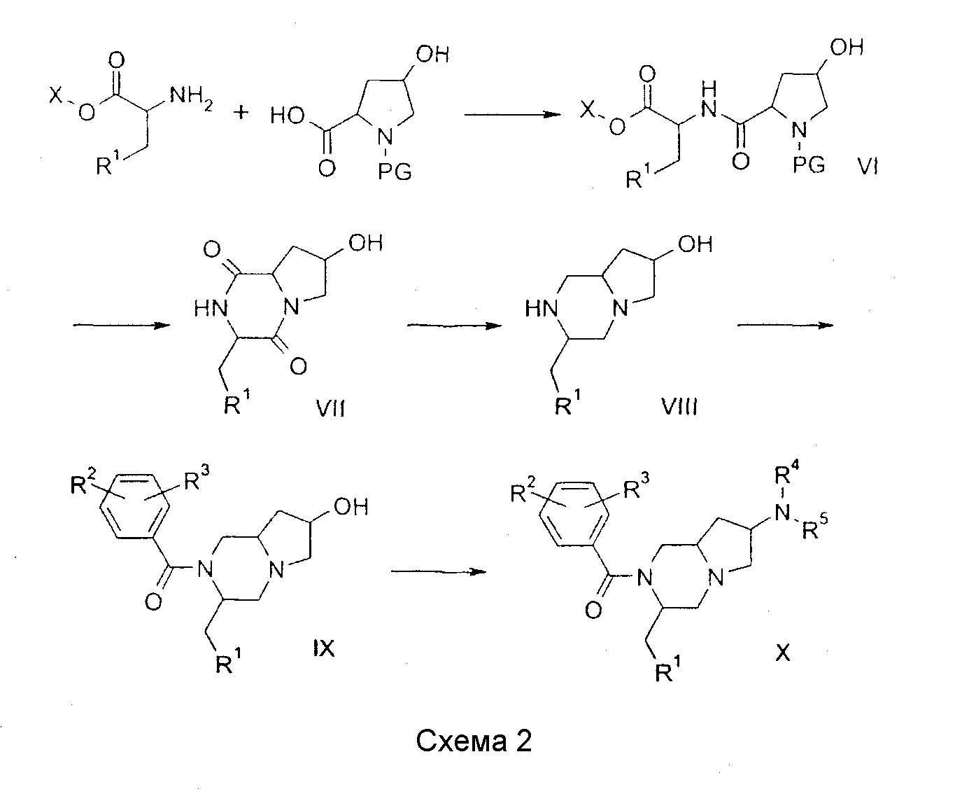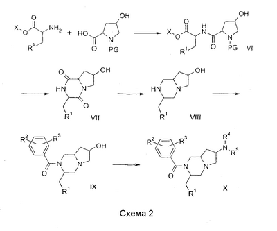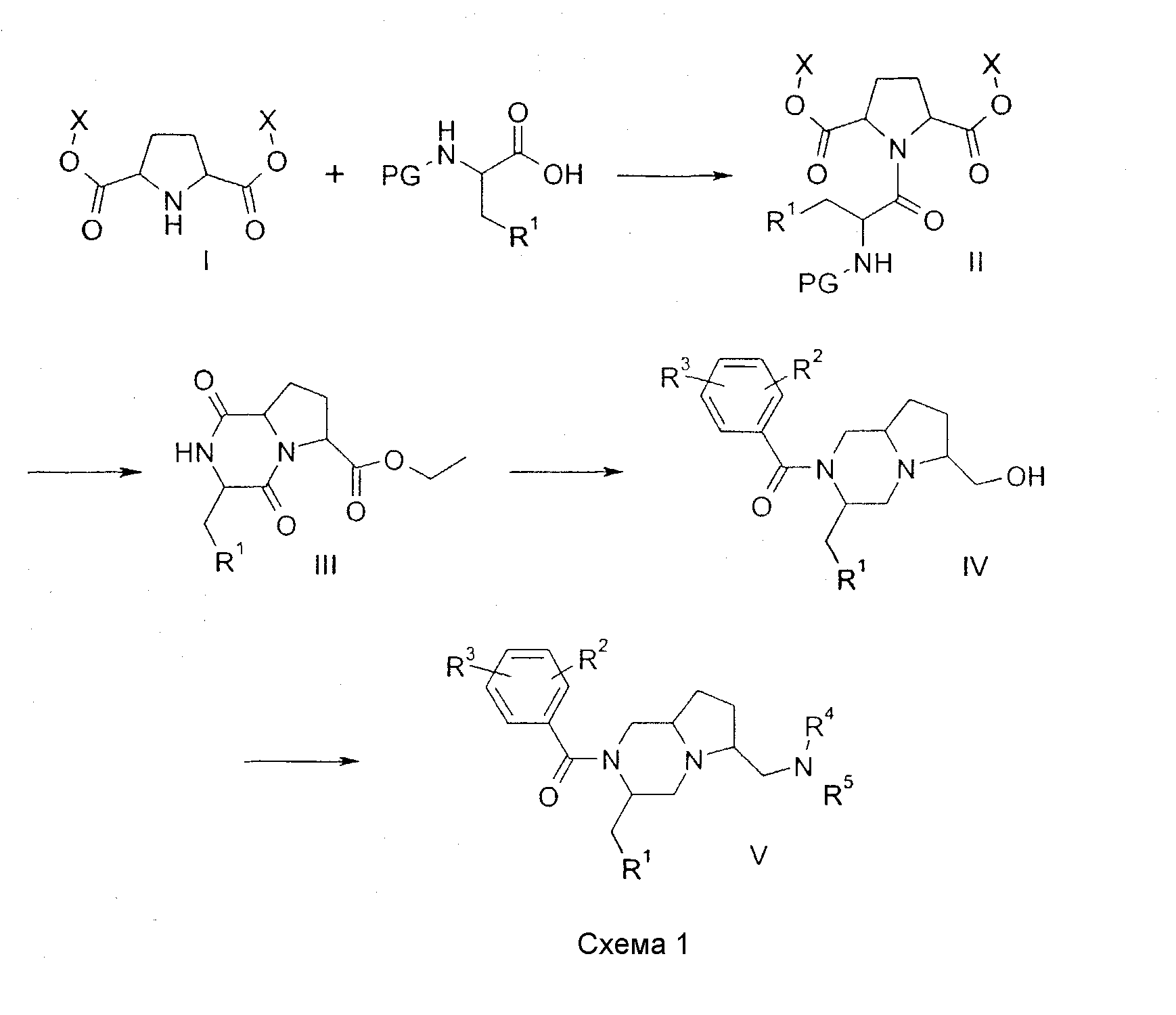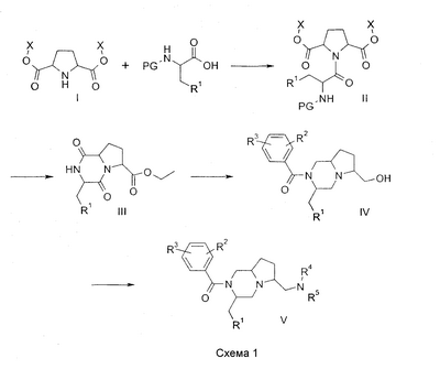 Настоящее изобретение относится к группе особенных производных диазабициклоалканов, имеющих интересную антагонистическую активность к рецептору нейрокинина NK1. Изобретение относится также к способу получения новых соединений и к фармацевтическим композициям, содержащим фармакологически активное количество по меньшей мере одного из таких соединений в качестве активного ингредиента. Из европейской патентной заявки ЕР 0655442 известны производные пиперазина с антагонистической активностью к нейрокинину. Новые производные пиперазина, разделяющие такую биологическую активность, раскрыты в ЕР 0899270, где описан ряд производных 2-(3-индолилметил)-1-бензоил-4-[(2-(бензиламино)этил)аминокарбонил]пиперазина, имеющих NK1-антагонистическую активность. Неожиданно было обнаружено, что производные пиперазина также являются NK1-антагонистами, когда пиперазиновое кольцо и его N-4 заместитель являются конденсированными, образуя производные 1,4-диазабицикло[4.3.0]нонана, 1,4-диазабицикло[4.4.0]декана или 1,4-диазабицикло[4.5.0]ундекана. Изобретение относится к соединениям общей формулы (1): где: – R1 представляет фенил, 2-индолил, 3-индолил, 3-индазолил или бензо[b]тиофен-3-ил, указанные группы могут быть замещены галогеном или алкилом (1-3С); – R2 и R3 независимо представляют галоген, Н, ОСН3, СН3 или CF3; – R4, R5 и R6 независимо представляют Н, ОН, О-алкил(1-4С), СН2ОН, NH2, диалкил(1-3C)N, пирролидин-1-ил, пиперидин-1-ил, морфолин-4-ил или морфолин-4-ил, замещенный одной или двумя метильными или метоксиметильными группами, морфолин-4-иламино, морфолин-4-илметил, имидазол-1-ил, тиоморфолин-4-ил, 1,1-диоксотиоморфолин-4-ил или 3-окса-8-азабицикло[3.2.1]окт-8-ил, R4 и R5 вместе могут представлять кетогруппу 1,3-диоксан-2-ил или 1,3-диоксолан-2-ил; – X представляет O или S; n имеет значения 1, 2 или 3; a является асимметричным атомом углерода 8а, 9а или 10а, когда n равно 1, 2 или 3 соответственно, и их фармацевтически приемлемым солям. Все соединения, имеющие формулу (1), в которой заместители у асимметричных атомов углерода 3 и “а”, а также у потенциально асимметричных атомов углерода 6 и 7, находятся в R-конфигурации или в S-конфигурации, охватываются изобретением. К изобретению принадлежат также пролекарства, т.е. соединения, которые, будучи введены человеку любым известным способом, превращаются в результате метаболизма в соединения, имеющие формулу (1). В частности, это относится к соединениям, в которых R4, R5 R6 представляет гидрокси или гидроксиметильную группу, типичным примером чего является 3,5-бис(трифторметил)фенил[6-гидроксиметил-3-(1Н-индол-3-илметил)гексагидропирроло[1,2-a]пиразин-2-ил]метанон (соединение 1 и его энантиомеры, см. ниже). Такие соединения могут быть этерифицированы, давая соединения, которые могут быть превращены в результате метаболизма в соединения, имеющие формулу (1). Изобретение, в частности, относится к соединениям, имеющим формулу (1), где R1 представляет 3-индолил, R2 и R3 являются группами CF3 в положениях 3 и 5, X представляет кетогруппу, n имеет значения 1 или 2 и “a”, R4, R5 и R6 имеют значения, указанные выше, включая все возможные стереоизомеры, как указано выше. Еще более предпочтительными являются соединения по изобретению, как оно описано выше, в которых R4 или R6 представляют или содержат или морфолино, или гидроксиметильную группу, R5 представляет водород, и стереохимией которых является 3R. Соединени