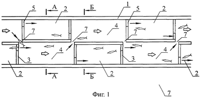При своем продвижении рыба имеет возможность выбора трасс и скоростных условий, формируемых вплывными отверстиями 5, 6 и 7.