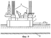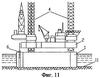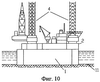 Затем осуществляют балластировку ЗЛК 1, ее погружение под воду, установку на дно 11 или удержание ее в подводном положении с помощью плавкранов 9, заводку СПБУ 2 над ЗЛК 1 и ориентирование ее таким образом, чтобы опорные колонны 4 находились над шахтными отверстиями 5 (фиг.7). При балластировке ЗЛК 1 осуществляют поддержание ЗЛК на тросах 10 с плавкранов 9 с тем, чтобы избежать при ее погружении рыскания последней в горизонтальных направлениях.