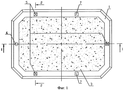 Защитная ледостойкая конструкция 1 представляет собой цельную двустенную оболочку с днищем и палубой по контуру оболочки, обладающую запасом плавучести за счет ее герметичности, с засыпкой грунтом 3 (песком) внутри в рабочем положении для обеспечения устойчивости конструкции при эксплуатации. Форма оболочки в плане и ее размеры определяются, исходя из схемы расположения опорных колонн 4 СПБУ 2 (СПБУ различного типа могут иметь три или четыре опорные колонны). Высота ЗЛК определяется глубиной воды, при которой намечается бурение разведочной скважины с учетом нормативного запаса над уровнем воды. Оптимальная глубина воды, при которой целесообразно использовать ЗЛК, составляет примерно 25-30 метров. При большей глубине воды ЗЛК возможно устанавливать на грунтовую отсыпку или на специальную фундаментную плиту.
