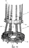 На фиг.13 изображен еще один вариант выполнения армирующего устройства 33, содержащего некоторое количество труб 20, через которые пропущены тросы 21, прикрепленные нижними концами к трубам 20 и кольцевым элементам 34, причем на верхних концах труб 20 прикреплены стопоры 24, каждый из которых в данном варианте соединен сразу с двумя трубами 20. Стопоры 24 здесь имеют Г-образную форму, что позволяет им зацепляться за нижний край 19 фундаментной сваи 2.