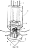 На фиг.10 изображено армирующее устройство 22, опущенное поршнем 28 под давлением под фундаментную сваю 2 в полость 3. Пружинное кольцо 25 разжато и давит на трубы 20, отжимая нижнюю часть труб 20 наружу относительно центра фундаментной сваи 2. Под воздействием раздвигающихся нижних частей труб 20 арматурные детали 26 также вынуждены раздвигаться при посредстве шарнирного соединения 29, так что детали 26 равномерно распределены в подошве (на чертеже не показана) в радиальном направлении.