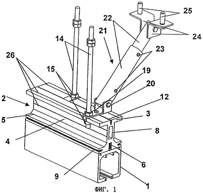 С верхней стороны верхней полки 3, а также с боковых сторон стенки 4 двутавровой балки предусмотрены один или несколько центрирующих пазов 26. В показанном на фиг.1 и 2 варианте в верхней полке 3 предусмотрено два центрирующих паза 26, которые проходят параллельно друг другу и параллельно верхнему крепежному каналу 12 под резьбовое соединение на одинаковом расстоянии справа и слева от него. С каждой стороны стенки 4 двутавровой балки также предусмотрено по два центрирующих паза 26, которые проходят параллельно друг другу.