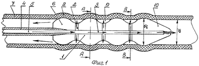 Изобретение поясняется чертежами, где на фиг.1 представлено устройство в трубе, общий вид, стрелками показано направление гидрожидкости; на фиг.2 – разрез А-А на фиг.1; на фиг.3 – разрез В-В на фиг.1.