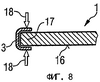 На фиг.8 проиллюстрирован способ изготовления фильтрующего элемента 1, выполненного по другому варианту. При этом металлическую полоску 3 загибают с обеих сторон вокруг краевого участка 17 волокнистого мата 16 из пористого, проточного для текучей среды материала. После этого краевой участок 17 волокнистого мата вместе с охватывающей его металлической полоской обжимают, прикладывая усилия в показанных стрелками 18 направлениях. Эту операцию предпочтительно выполнять при роликовой сварке, что позволяет одновременно с обжатием металлической полоски 3 соединять ее сваркой с волокнистым матом 16.