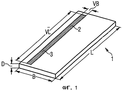 На фиг.1 показан фильтрующий элемент 1, который имеет в продольном направлении длину L, в поперечном направлении ширину В и толщину D. Фильтрующий элемент 1 выполнен из по меньшей мере частично проточного для текучей среды пористого материала. Подобный фильтрующий элемент 1 можно, в частности, изготавливать из металлических волокон, прежде всего из спеченных металлических волокон. Фильтрующий элемент 1 имеет повышающий его жесткость или усиливающий участок 2, ширина VB которого меньше ширины В фильтрующего элемента 1. Длина VL усиливающего участка меньше соответствующей длины L фильтрующего элемента 1.