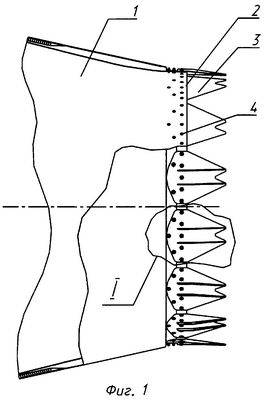 При работе газотурбинного двигателя шевроны 3 на выходном торце имеют значительные знакопеременные нагрузки, в результате которых во время эксплуатации могут возникнуть дефекты (трещины, коробление и др.), поэтому выполнение шевронов 3 отдельно от сопла 1 с креплением с помощью крепежных элементов 4 позволяет выполнить замену шевронов в процессе эксплуатации, что повышает ресурс и ремонтопригодность сопла. Применение шевронов 3 в сочетании с рассекателями 5, установленными на шевронах, позволяет получить заметное снижение шума струи при незначительном возрастании потерь тяги в двигателе. При обтекании шевронов 3 создаются условия для появления взаимного скоса двух потоков: основного потока газа, истекающего из сопла, и потока воздуха, идущего по наружной обечайке сопла. В результате этого возникает разность скоростей двух потоков, которая сопровождается вихреобразованием, что, как известно, приводит к снижению уровня шума. Рассекатели 5, расположенные на шевронах 3, усиливают процесс вихреобразования. Результаты испытаний указанной выше конструкции показали, что использование сопла с шевронами и с расположенными на них рассекателями уменьшает уровень шума на 1,2 дБ по сравнению с использованием обычного сопла.