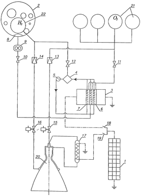 Электрический выход СБ 1 через контакты выключателей цепи электролизера 18 и цепи теплообменника 19 соединен с электролизером с ТПЭ 3 и теплообменником 17. Бак с водой 2 через КЗУ 8, водяной насос 9 и обратный клапан 10 соединен с электролизером с ТПЭ 3. Выходы баков с газообразным кислородом 21 и газообразным водородом 22 через редукторы кислорода 13, водорода 14 и ЭПК кислорода 15 и водорода 16 соединены с КС 20, причем для запуска двигателя используется теплообменник 17, в котором водород после прохождения через рубашку охлаждения КС подогревается до температуры не менее температуры его самовоспламенения с кислородом.