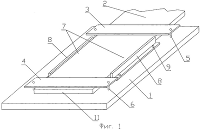 Поперечные балки 3 и 4 препятствуют смещению конца ленты 2 в продольном направлении, а ограничительные планки 8 – в поперечном.
