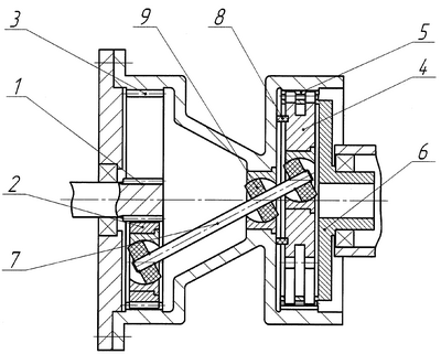 Вращательное движение передается от солнечной шестерни быстроходной ступени 1 сателлиту 2, а через него и через неподвижное центральное колесо 3 водилу 7. Водило 7, установленное на сферическом подшипнике 9, передает вращательное движение двухвенцовому сателлиту 4 тихоходной ступени, а через него и через неподвижное центральное колесо 5 тихоходному центральному колесу 6. Полиамидное кольцо 8 воспринимает осевую силу, действующую на двухвенцовый сателлит 4 со стороны водила 7.
