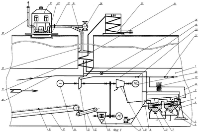 Подземный энергокомплекс работает следующим образом. В выработке 1 транспортером 15 уголь 16 из зоны добычи подается на дозатор 12, затем в дробильный агрегат 11. Измельченное в агрегате 11 до необходимой фракции угольное топливо эжектором 9 подается по воздуховоду 8 в полость 4 камеры сгорания 3. Проходя последовательно через все секции верхней полости 4 камеры сгорания 3, воздушно-угольная смесь, интенсивно перемешиваясь, образуя «кипящий поток», почти полностью сгорает. При этом образуется высокотемпературная среда, от которой верхний слой воды в полости 5 камеры сгорания 3 превращается в пар, образуя парогазовую смесь. Совместно газы от сгорания угля и пара образуют турбулентные потоки парогазовой смеси в полости 4 и в полости 5, заполненной водой камеры сгорания 3. Парогазовая смесь по каналу 24 подается в стабилизатор 22. В нем приводится к необходимой температуре, скорости потока и через дроссельные заслонки 20, 21 подается на турбину 13, приводя ее совместно с электрогенератором 14, компрессором 10 и дробильным агрегатом 11 во вращение. (Первоначальный запуск дробильного агрегата 11, генератора 14 и компрессора 10 осуществляется от электродвигателей М2 (23) и М1 с индивидуальными источниками питания.) При работе компрессора 10 эжектор 9 отключается. В последующем измельченный уголь поступает в полость 4 камеры сгорания 3 от работы компрессора 10. Отработанная с турбины 13 высокотемпературная парогазовая смесь сбрасывается в вентиляционную сбойку 2. Определенное количество газопаровой смеси через регулятор потока 25 по каналу подается в регенератор 7, за счет чего вода в полости 5 камеры 3 нагревается. Отработанная парогазовая смесь от регенератора 7 сбрасывается по каналу в вентиляционную сбойку 2. Нагретая вода в полости 5 камеры 3 в совокупности с парогазовой смесью в полости 4 способствует увеличению ее турбулентного течения. В результате она интенсивно перемешивается с парогазовой средой и становится воздушно-взвешенной (рыхлой), от чего ее плотность резко уменьшается. От работы устройства 6 по разложению методом электролиза шахтной воды на кислород и водород из объема воды полости 5 камеры сгорания 3 будет интенсивно выделяться водород и кислород при минимальном расходе электрической энергии. Выделенный из воды водород поступает в верхнюю полость 4 камеры 3 – зону горения, где сгорает совместно с углем. Из-за высокой калорийности от сгорания водорода в зоне горения полости 4 камеры 3 резко повышается температура парогазовой смеси и скорость ее перемещения. При этом измельченный уголь полностью сгорает с минимальным образованием золы. С момента поступления газа водорода в полость 4 камеры сгорания 3 объем подачи угля в зону горения резко уменьшается. Зола от сгорания угля оседает на дно полости 5 камеры сгорания 3 и с накоплением удаляется через систему золоудаления 33. Основной поток отработанной парогазовой смеси с турбины 13 сбрасывается в вентиляционную сбойку 2, который проходит через теплообменный аппарат 17. Горячий поток парогазовой смеси нагревает в теплообменном аппарате 17 воду, закачиваемую по водоводу 18 из шахтного водоотлива. Нагретая вода по водоводу 26 поступает в устройство по отбору тепла 27, установленное на поверхности земли. «Отобранное тепло» с устройства 27 используется на обогрев промышленных, технологических и д