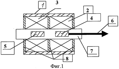 Конструкция дифференциального индуктивного преобразователя, обладающего скомпенсированной мультипликативной погрешностью при различной температуре его идентичных частей, представлена на фиг.1, где цилиндрический полый корпус – 1, первая секция катушки индуктивности – 2, вторая секция катушки индуктивности – 3, подвижный ферромагнитный сердечник – 4, жестко закрепленный ферромагнитный сердечник – 5, измерительный шток – 6, трубка – 7, щечки – 8.