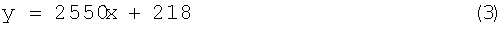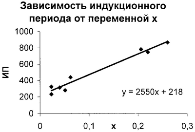 Из результатов испытаний образцов, приведенных в таблице, можно видеть, что как увеличение концентрации кислоты выше 98,0%, так и понижение концентрации кислоты ниже 97,0% приводит к недостоверным результатам определения. Таким образом, исследования показали, что этот способ позволяет достоверно определить индукционный период в бензинах при использовании серной кислоты с концентрацией от 97,0% до 98,0%. Время определения, затраченное на одну пробу, составляет не более 25 минут по сравнению с временем определения по прототипу, где время определения составляет не менее 3-4 часов для наиболее нестабильных бензинов (ИП=230) и более 20 часов для стабильных бензинов (ИП=1200). Расчет коэффициентов А и В На чертеже приведена зависимость индукционного периода (Y) от переменной X, y=Ax+B (1) Как видно из полученных данных, зависимость индукционного периода от расчетной величины X имеет явную прямолинейную зависимость, выраженную уравнением y=2550x+218 (3) В полученном уравнении A=2550 и B=218, если подставить эти значения в уравнение 2, то по полученным экспериментально данным (T0, Tк, t, I) получим результаты индукционного периода, расчетного для данного образца пробы.