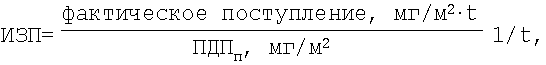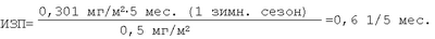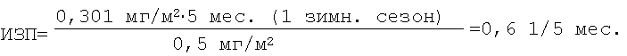 Способ оценки интенсивности загрязнения почв тяжелыми металлами по результатам исследования снежного покрова, в котором отбирают пробы снега, отфильтровывают нерастворимую пылевую часть снежной массы, высушивают ее и взвешивают, затем определяют массу поступления пыли Ппыли на 1 м2 подстилающей поверхности по формуле: Ппыли=P0/(S·t), где Р0 – масса пыли в пробе, г; S – площадь шурфа при отборе снеговой пробы снегоотборником, равная площади снегоотборника, умноженной на количество кернов, м2; t – время от начала установления устойчивого снежного покрова до момента отбора проб, мес.; после чего определяют поступление тяжелых металлов Птм на 1 м2 обследуемой подстилающей поверхности по формуле: Птм=Ппыли·С, мг/(м2·t), где С – концентрация тяжелого металла в пробе пыли, мг/кг; и затем вычисляют интенсивность загрязнения почв в единицах ПДКп на обследуемой территории тяжелыми металлами (ИЗП) за определенный период времени по формуле: ИЗП=Птм/ПДПп, 1/t, где ПДПп – предельно-допустимое поступление тяжелого металла на почву – поступление тяжелого металла в составе водонерастворимых выпадений (пыли) из атмосферного воздуха на 1 м2 территории, вызывающее повышение содержания тяжелого металла в 1 кг почвы на 1 ПДКп, численно равное 1 ПДКп, мг/м2; ПДКп – предельно-допустимая концентрация тяжелых металлов в почве, мг/кг.