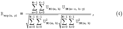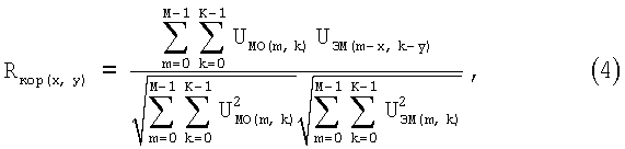 (где UMO и UЭМ – амплитуды сигналов МО и ЭМ соответственно; М и К – размеры матрицы обнаружения; m и k – текущие координаты ячеек МО; х и y – координаты ячейки МО, с которой начинается отыскание значения корреляционной функции Rкор(x,y)), вычисляет значение корреляционной функции Rкор(х,y) для каждого возможного взаимного положения ЭМ и МО;