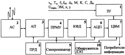 В РЛС для обнаружения проводов ЛЭП первый вход ЗУ 1 предназначен для ввода в него начальных данных, а второй вход, являющийся одновременно и его выходом, соединен с первым входом ЦВМ 7, являющимся одновременно и ее первым выходом, второй вход ЦВМ 7 соединен с выходом АЦП 6, первый вход которого соединен с выходом КФД 5, первый вход которого соединен с выходом ПРМУ 4, первый вход которого соединен со вторым выходом АП 3, первый вход которого, являющийся одновременно и его первым выходом, соединен с входом антенной системы 2, являющимся одновременно и ее выходом, второй вход АП 3 соединен с выходом ПРД 8, выход синхронизатора соединен с входом ПРД 8, вторым входом ПРМУ 4, вторым входом КФД 5, вторым входом АЦП 6, третий выход ЦВМ 7 предназначен для выдачи информации потребителям информации, обнаружитель ЛЭП 10, вход которого, являющийся одновременно и его выходом, соединен с третьим входом ЦВМ 7.